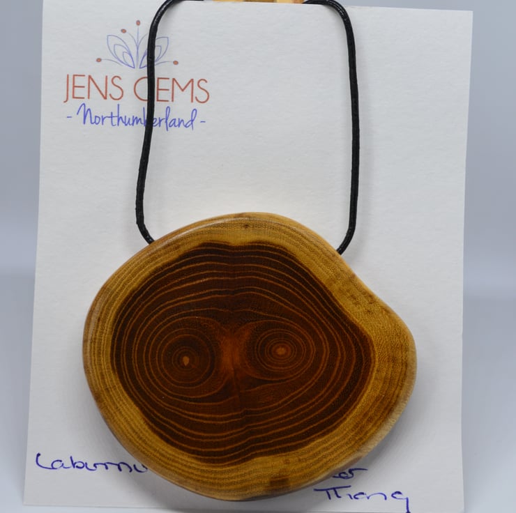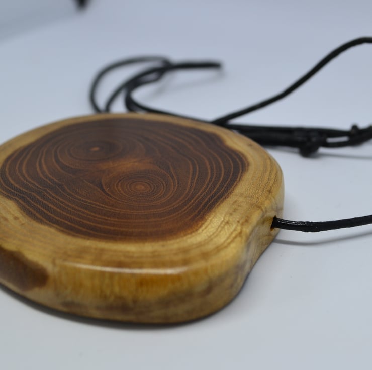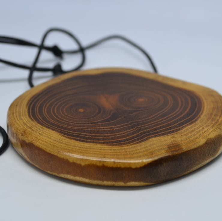 A large, chunky laburnum wood pendant. Graham has sanded the pendant to enhance the woods beautiful rings. The heart wood (wood in the center) is a lovely chocolate brown and the sap wood (wood around the edge) is a much lighter shade. The pendant itself is approx. 7.8cm x 6.5cm and approx. 1cm thick. The pendant is strung with a good length of 2mm black leather cord and has sliding knots so the length can be adjusted.