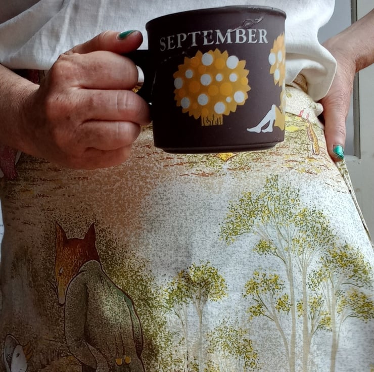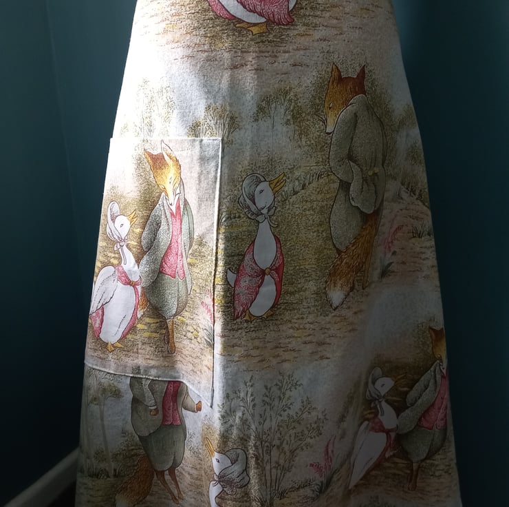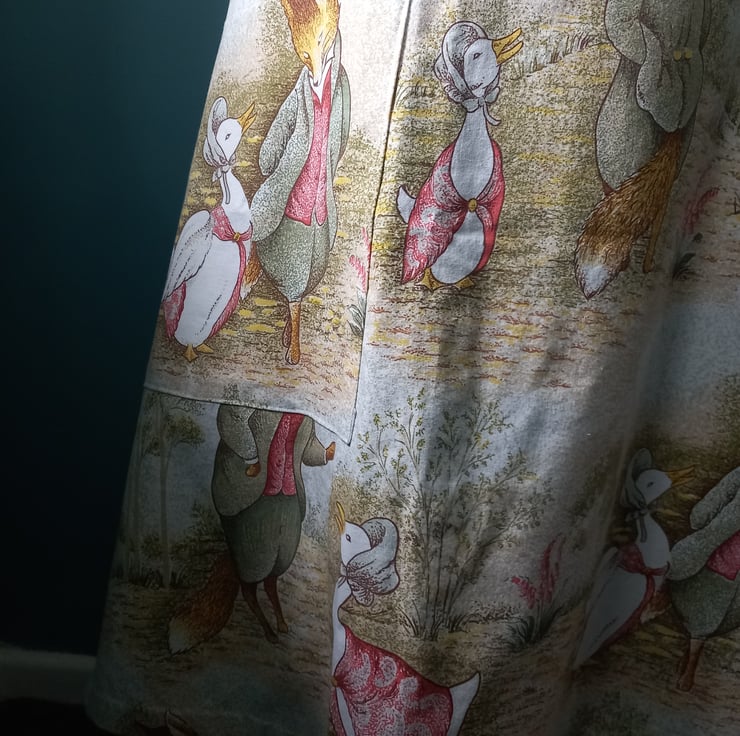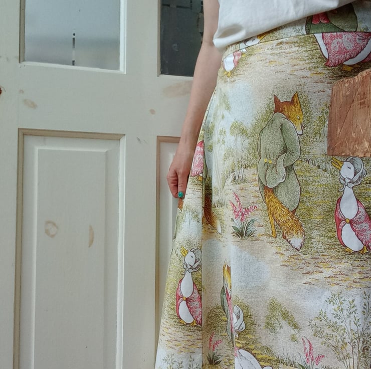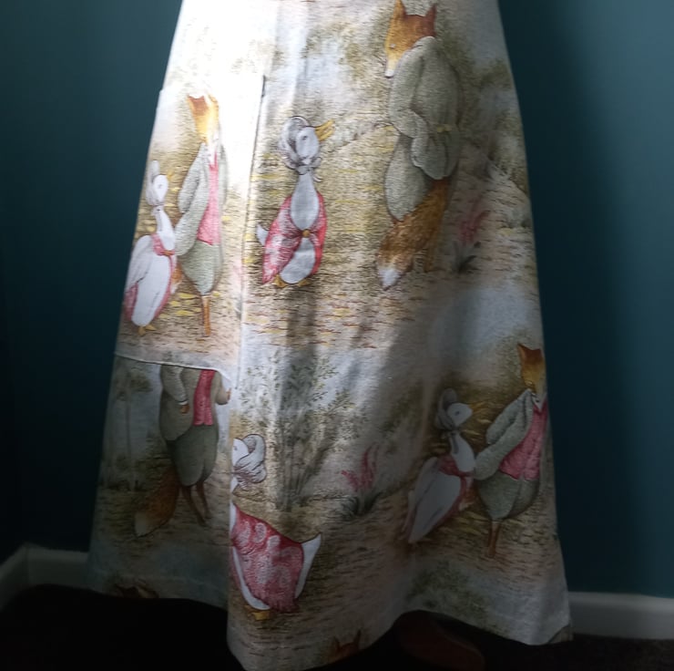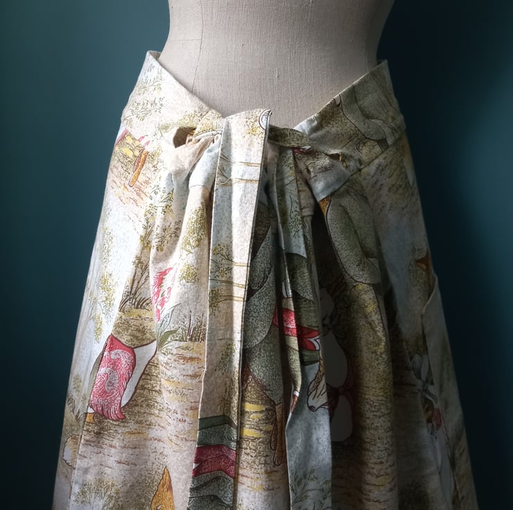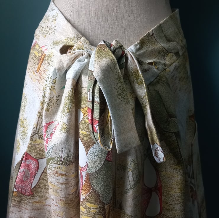 This clever skirt design is neatly made, adjustable waist as pulls together at the back into a gather. Fits from a size 10 to a size 14. with a big over sized pocket and all seems have been overlocked. Beautiful vintage fabric Feels dreamy to wear especially with a petticoat and boots.