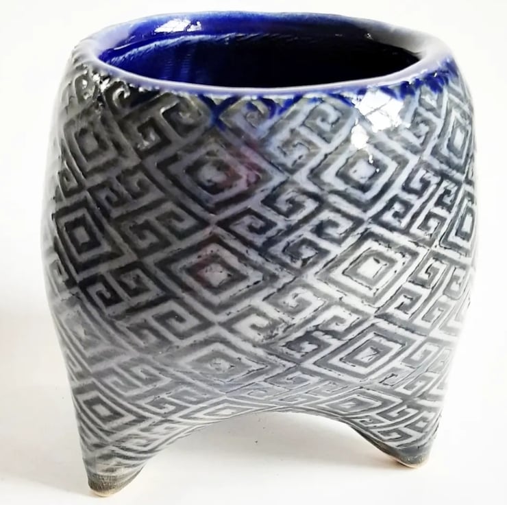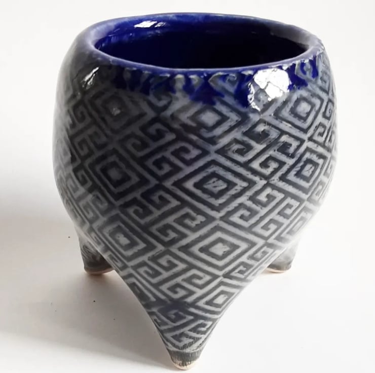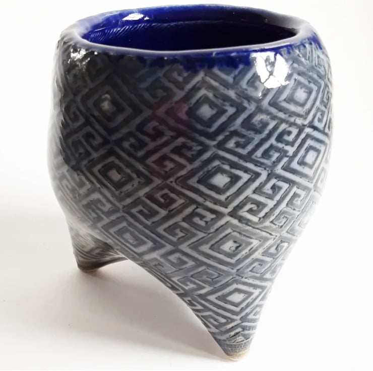 Glazed in blue glaze on the outside and navy blue on the inside. It has a pattern around the outside