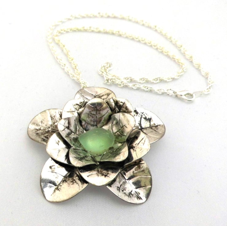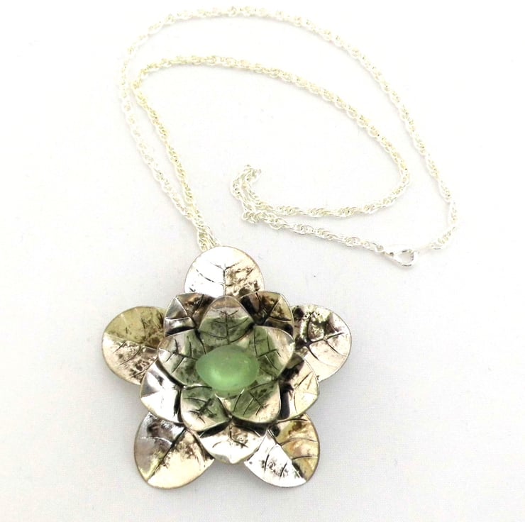 This beach inspired statement necklace is made from a silver tone metal flower harvested from vintage costume jewellery. I have added the seaglass, which I collect myself on the beaches of Devon and Cornwall.