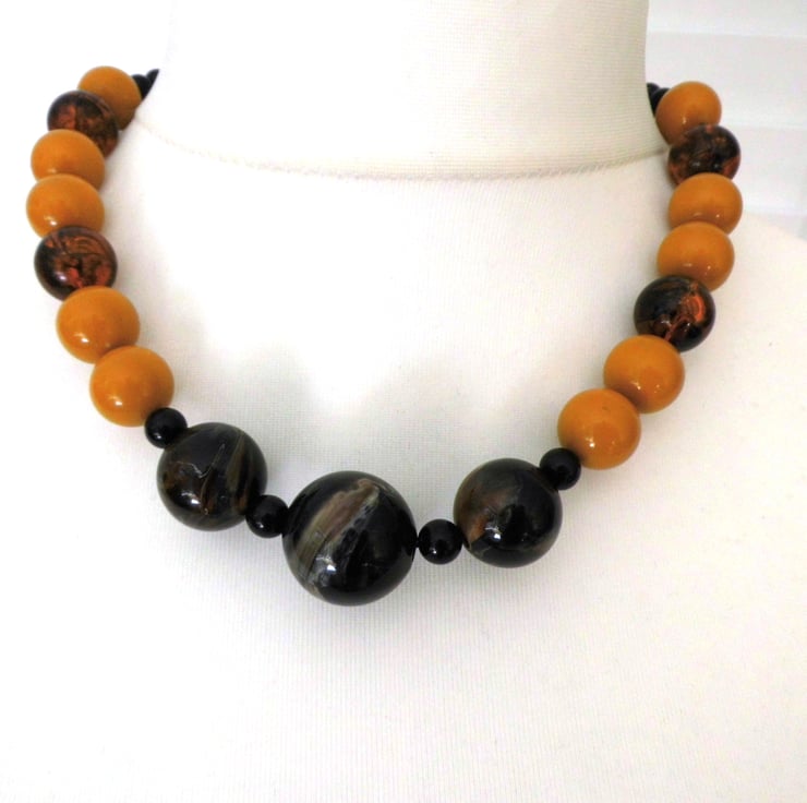 This chunky bead collar necklace is made from large black marbled centre beads with black, translucent amber and ochre orange beads.