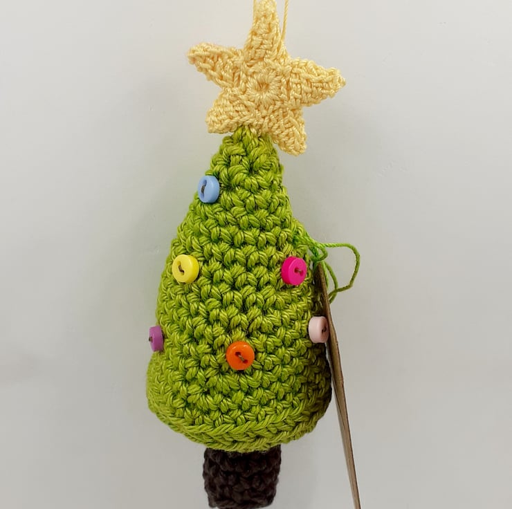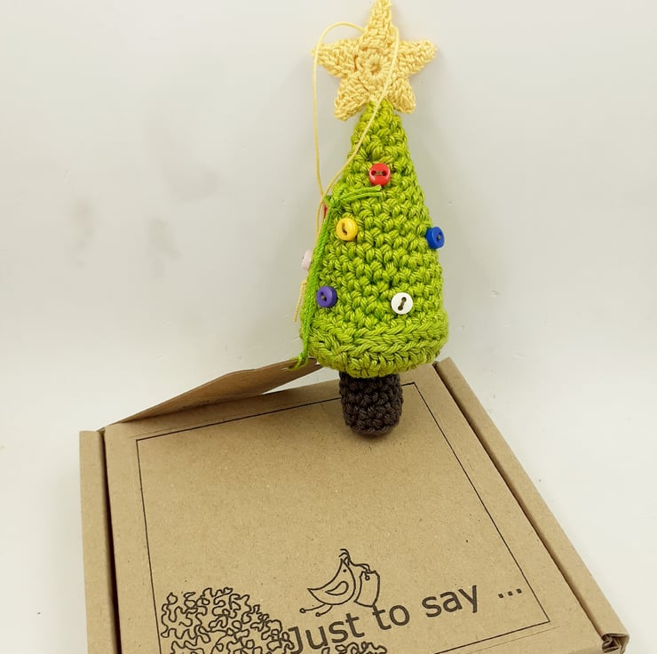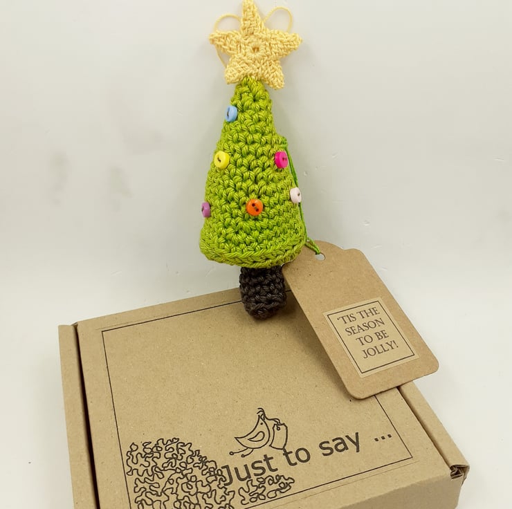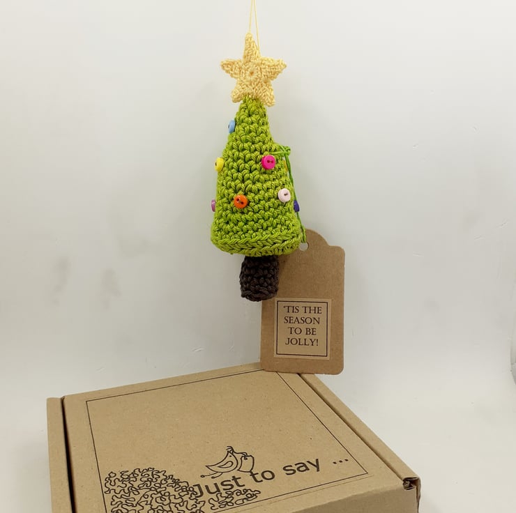 This cheerful tree decoration is crocheted in cotton and filled with polyester stuffing. It is decorated with tiny acrylic buttons and has a bright star on top. There is a strong but fine hanging loop and a tag which reads, ' Tis the season to be jolly!' Please note that I am very happy to exchange this tag for one with wording of your choice.