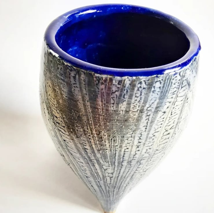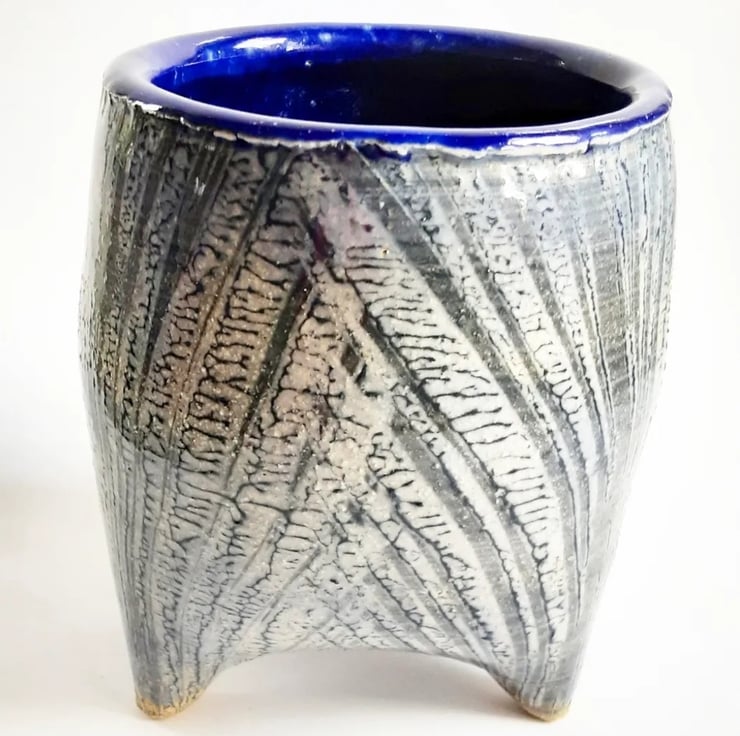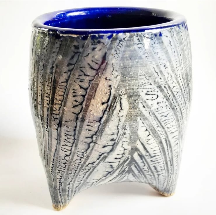 Glazed in blue glaze on the outside and navy blue on the inside. It has a pattern around the outside