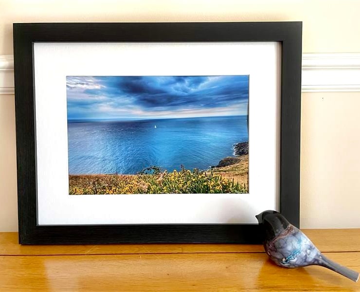Taken on the beautiful coastline of Soar Mill Cove in Devon on a stormy day, this high-quality print shows a small boat heading out at sea and into an oncoming storm. The vibrant yellow flowers along the path add a sunny contrast against the dark blue sky.