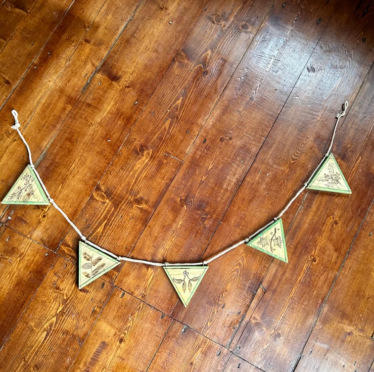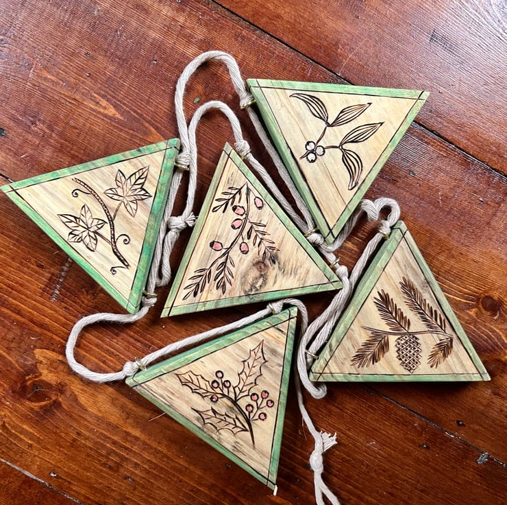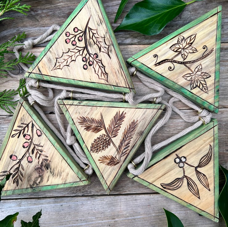 Wooden bunting cut and finished from reclaimed timber with depictions of winter flora, ivy, yew, mistletoe, holly and pine hand drawn using a pyrography pen. The edges are detailed with both pyrography and green coloured pencil and some of the berries have been given accents of colour. Supplied ready to hang in almost any setting (even outdoors, as all pieces are finished with furniture oil to protect and preserve them, although see below regarding care and weathering)