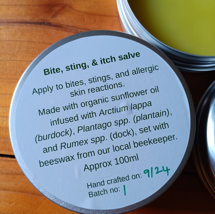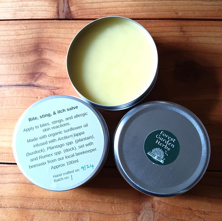 This salve is infused with burdock, dock, and plantain. It can be applied to bites, stings, and allergic skin reactions. It's made with organic sunflower oil and beeswax from our local beekeeper. Approx 100ml.
