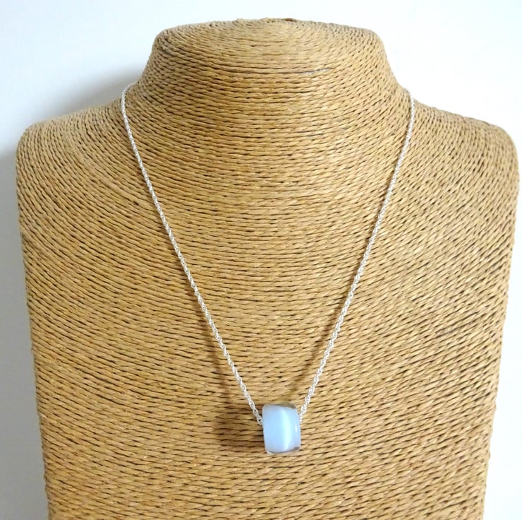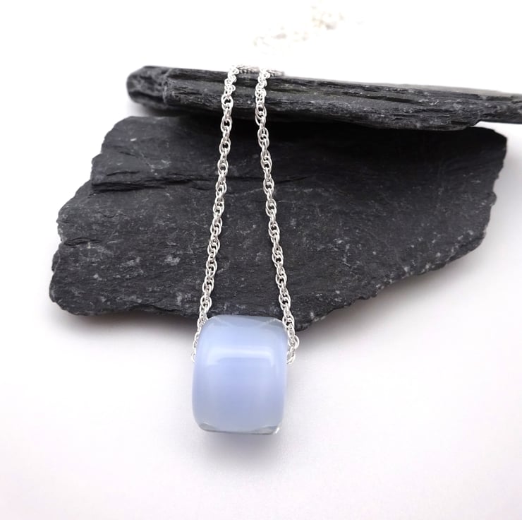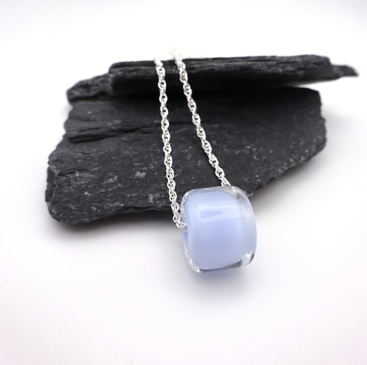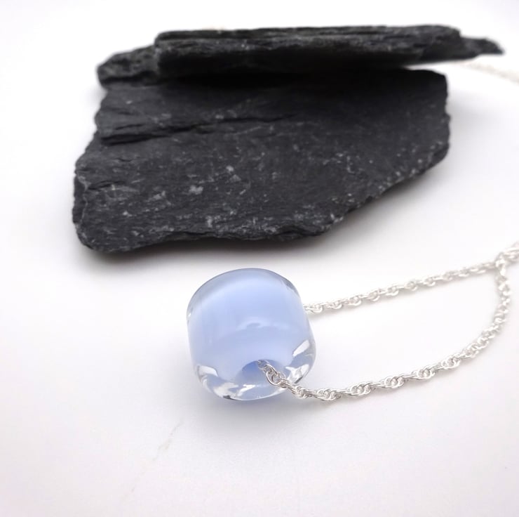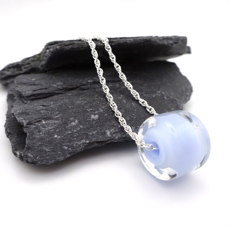 It features a sterling silver chain strung with a handmade lampwork glass blue bead.