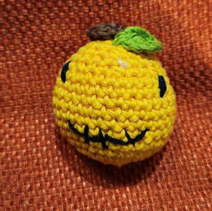 A teeny Halloween pumpkin Jack-O’Lantern. Hand made amigurumi crochet. Measures approximately 6cm high. About the size of a small satsuma.
