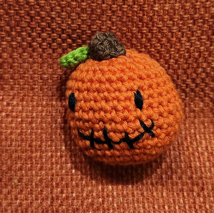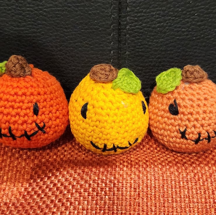 A teeny Halloween pumpkin Jack-O’Lantern. Hand made amigurumi crochet. Measures approximately 6cm high. About the size of a small satsuma.