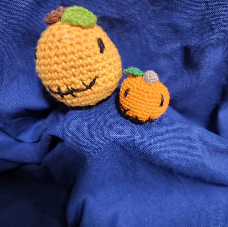 2 teeny Halloween pumpkins, Jack-O’Lantern. Hand made amigurumi crochet. Measures approximately 6cm high. About the size of a small satsuma.