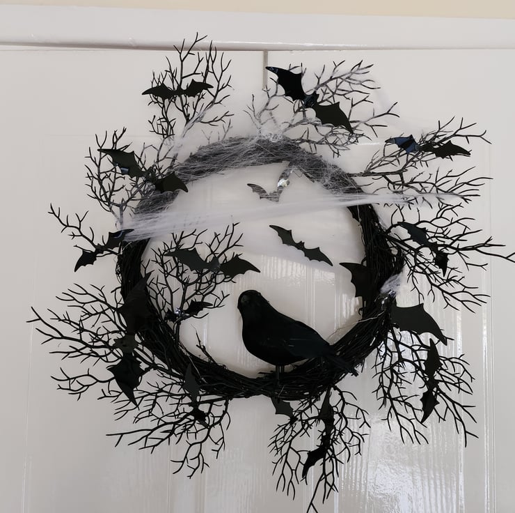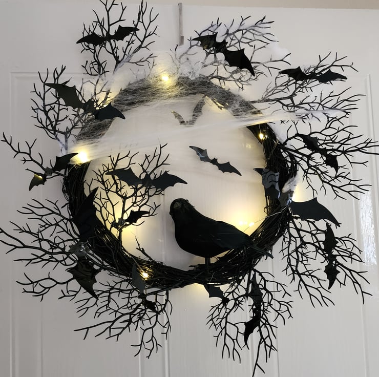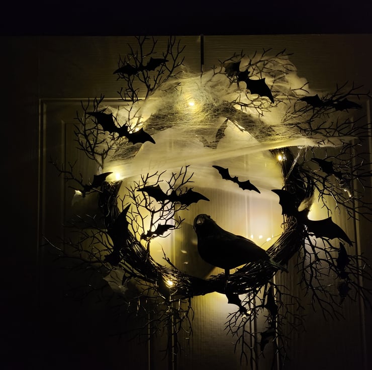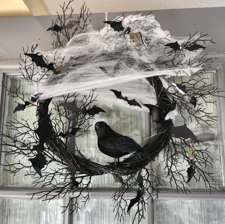 Rattan grapevine wreath, platic black tree branches flying scary bats and crow. Decorated with spider web and battery operated LED light.Frightful fun.
