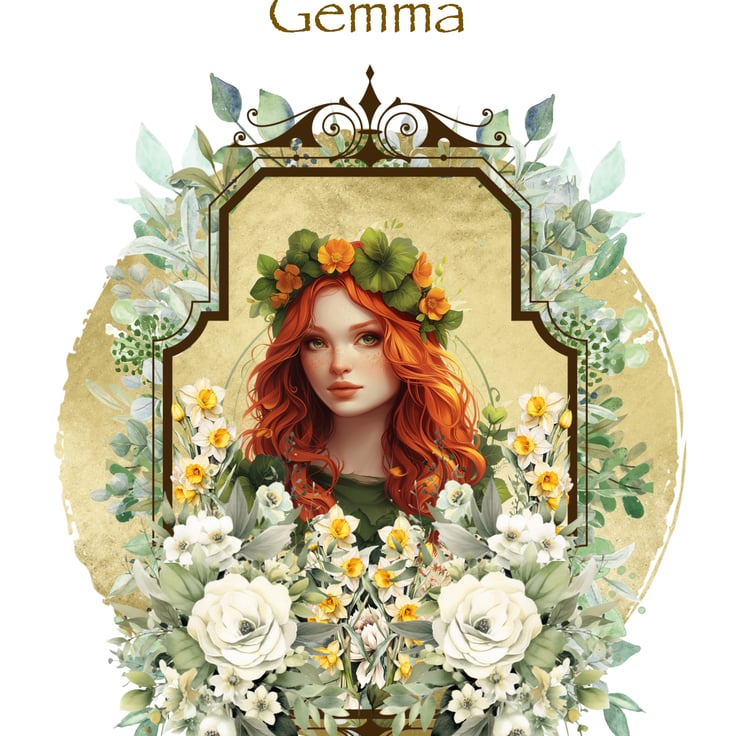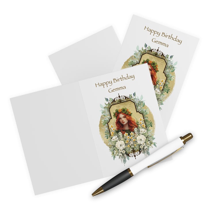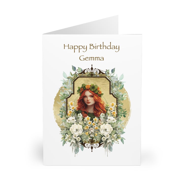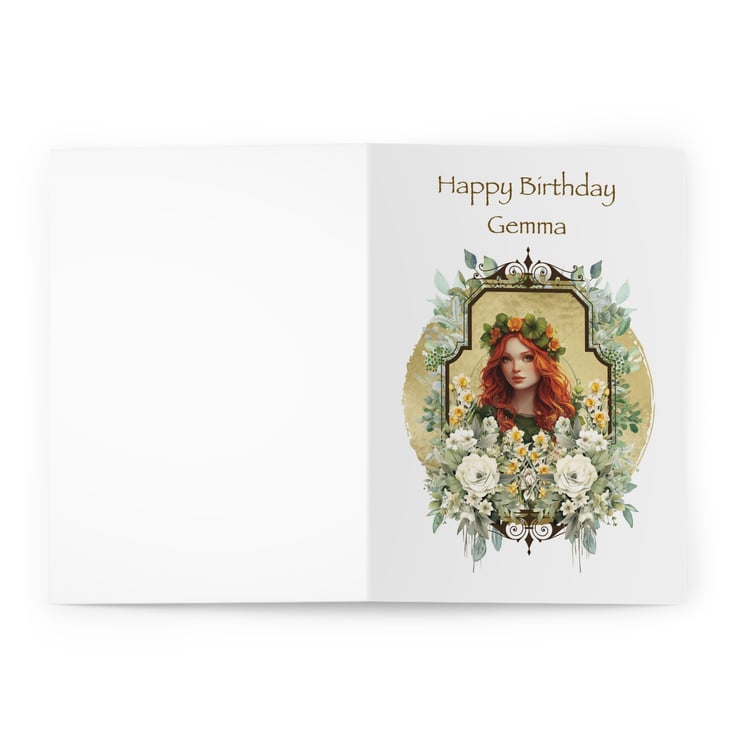 This Art Nouveau inspired card features a red-haired Goddess as Maiden framed in a green circle with Art Nouveau style adornment. The frame is decorated lavishly with green and silver foliage. Aimed at Pagans, Wiccans, Wise Women, and fans of Tolkien and other fantasy realms the card can be personalised for the recipient, or left blank.