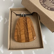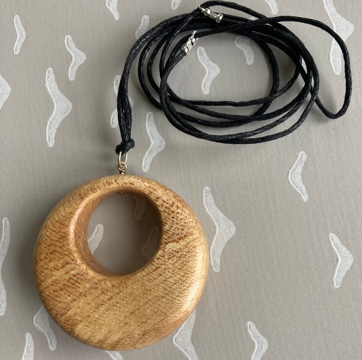A handmade wooden pendant using a light and beautifully patterned sycamore, finished with a hard wax satin polish. The pendant is approximately 5cm in diameter and 1.5cm thick at the base with a 2.5cm offset hole.