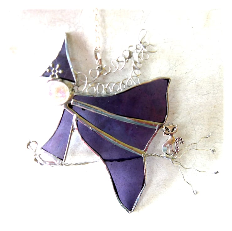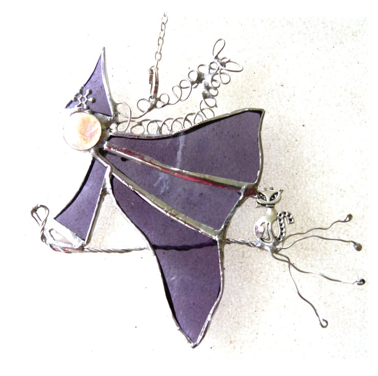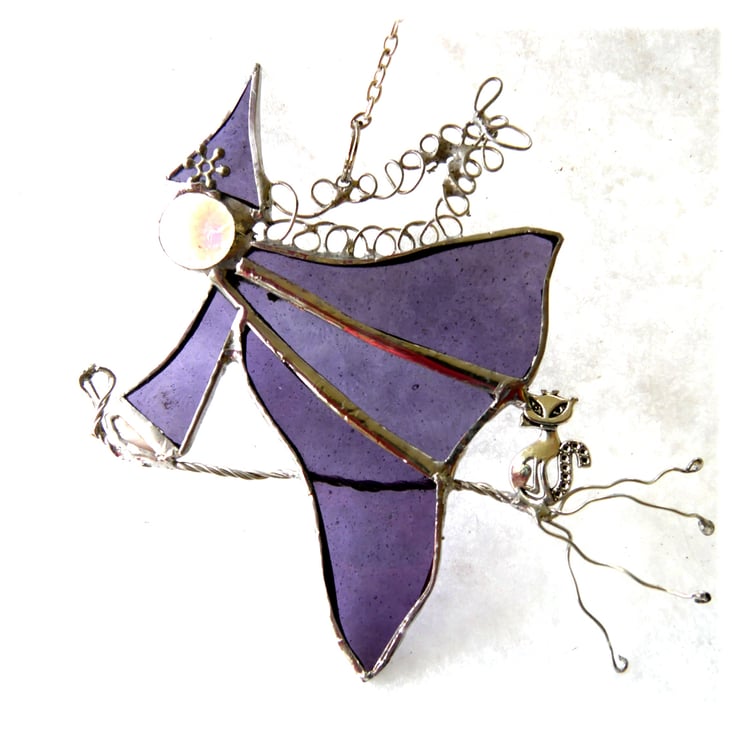 The witch is riding the skies on her broomstick which is made from twisted wire. Her cat rides behind.