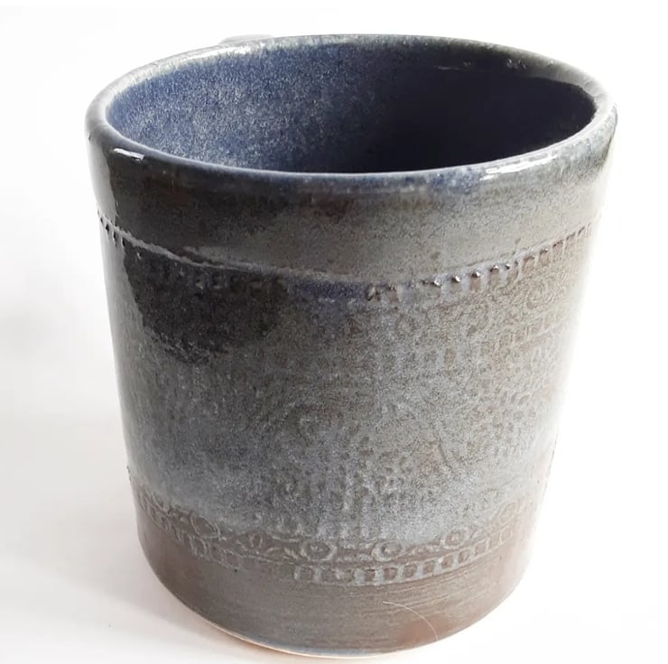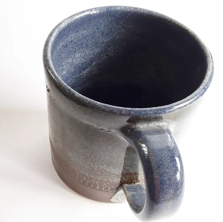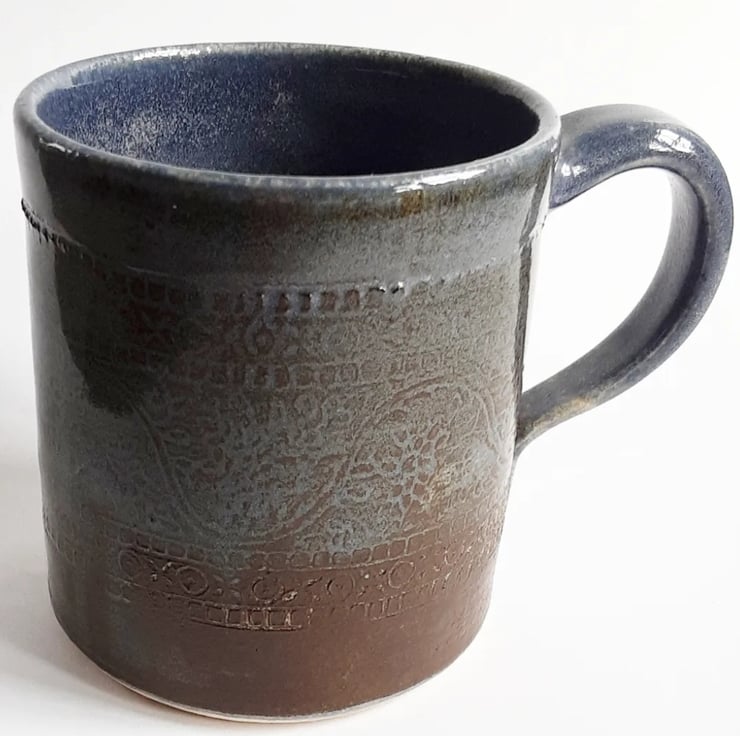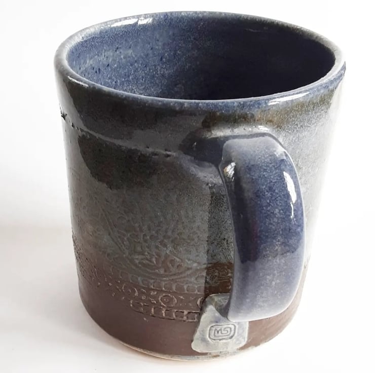 Glazed in teal and brown glazes with a pattern on the mug.