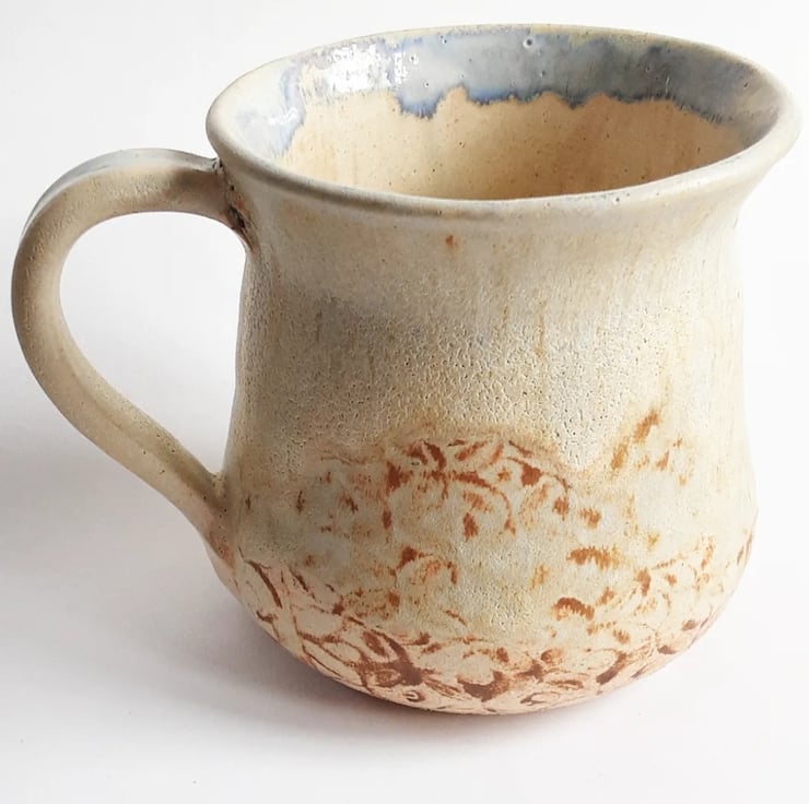 Glazed in caramel and cream glazes with a pattern on the mug.