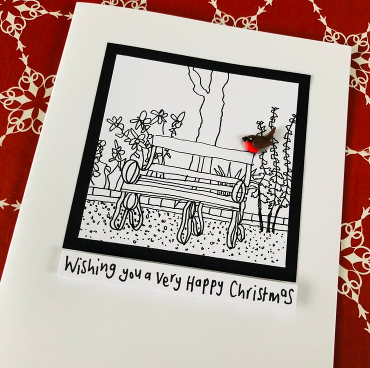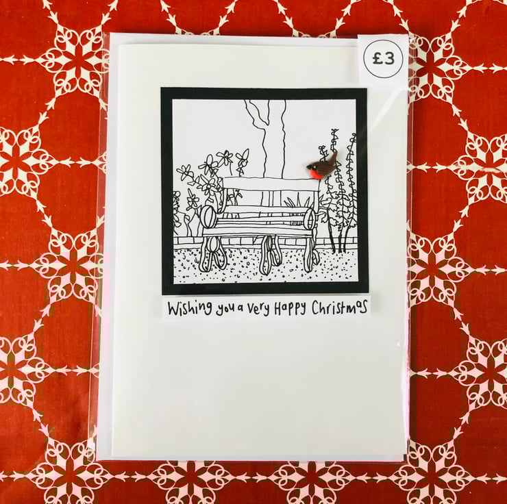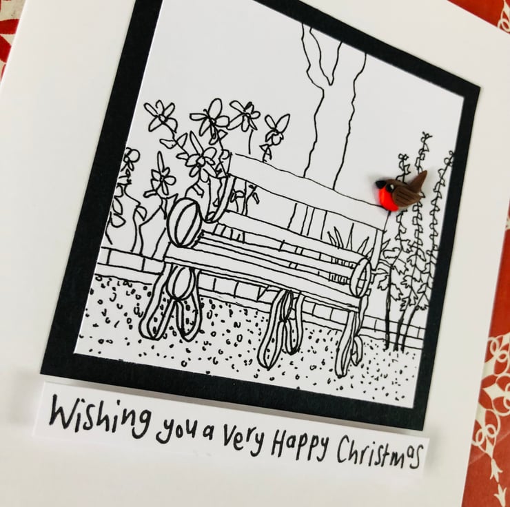 Inspired by walks in the countryside, this print/polymer clay mix card is a striking combination and a stand out on the shelf of cards with its handmade design. I love the way it carries an element of reflection, with the robin as a ray of hope in a colourless view.