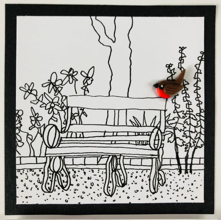 This vibrant tactile card is a print of an a pen miniature artwork and is mounted on black, to give the design a beautiful framed perspective. The polymer clay robin has been attached to give this card a tactile and 3D element.