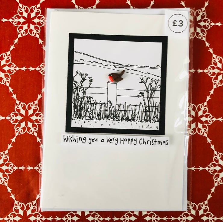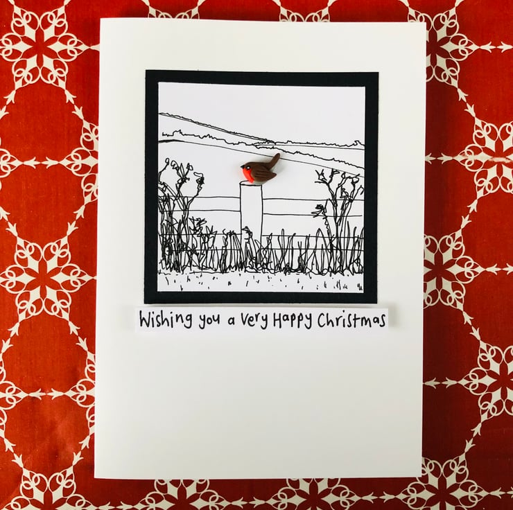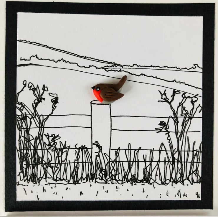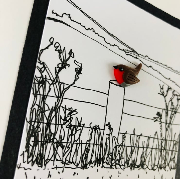 Inspired by walks in the countryside, this print/polymer clay mix card is a striking combination and a stand out on the shelf of cards with its handmade design. I love the way it carries an element of reflection, with the robin as a ray of hope in a colourless view.