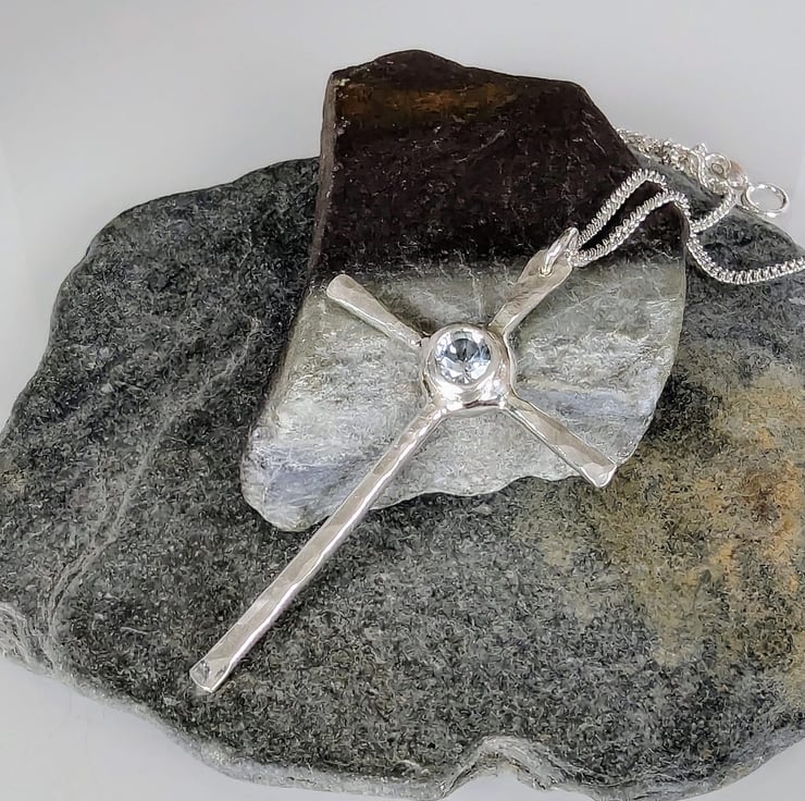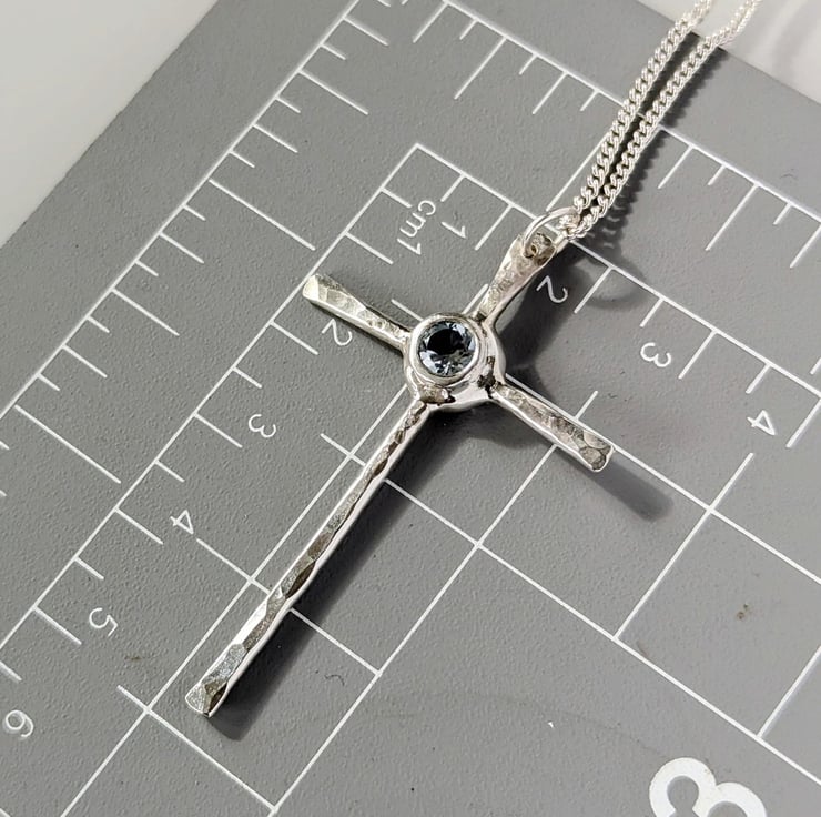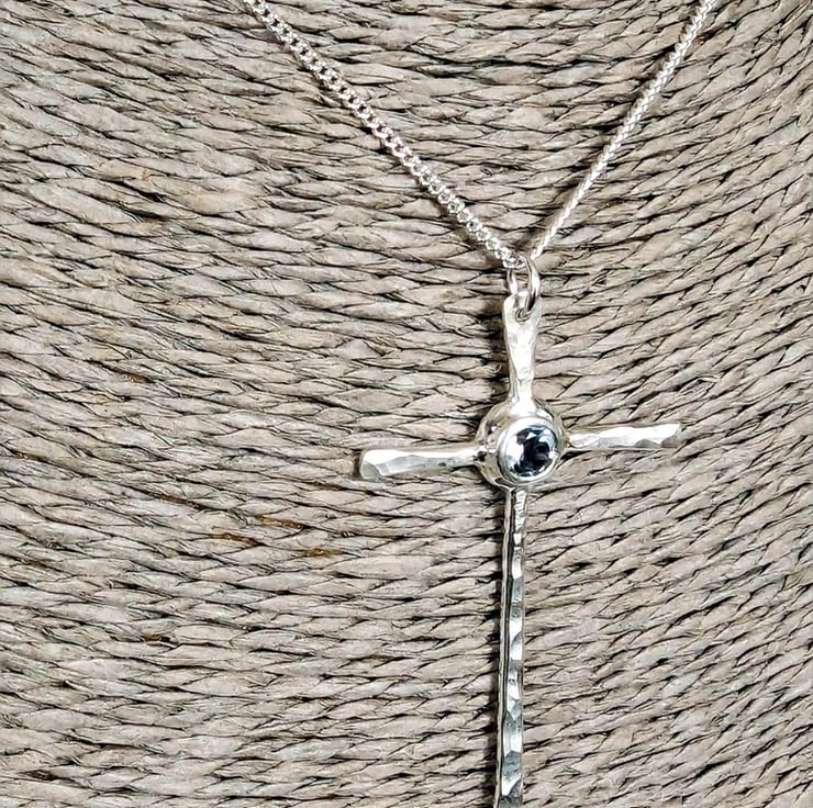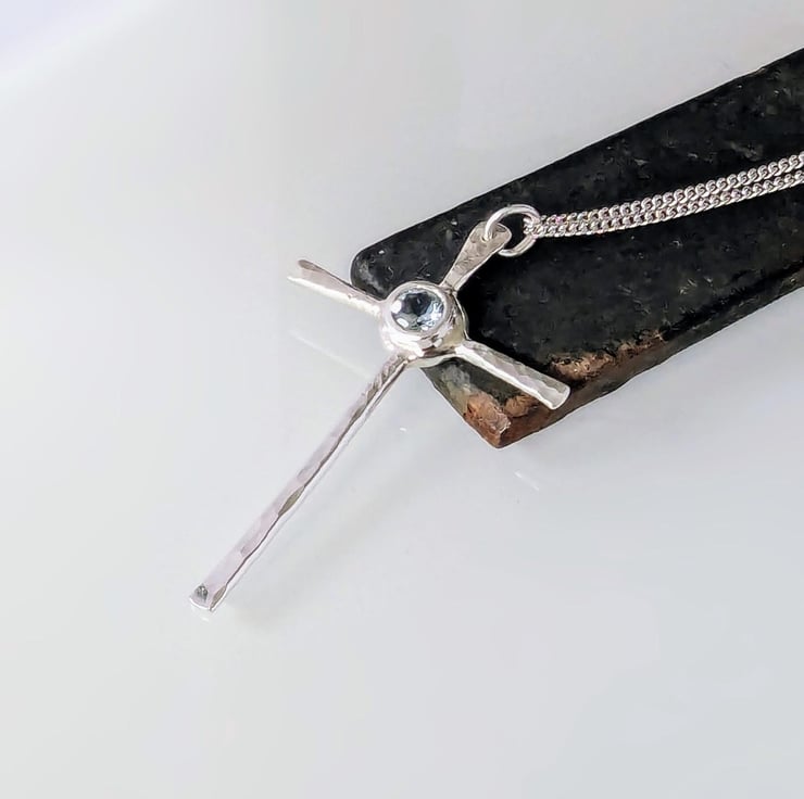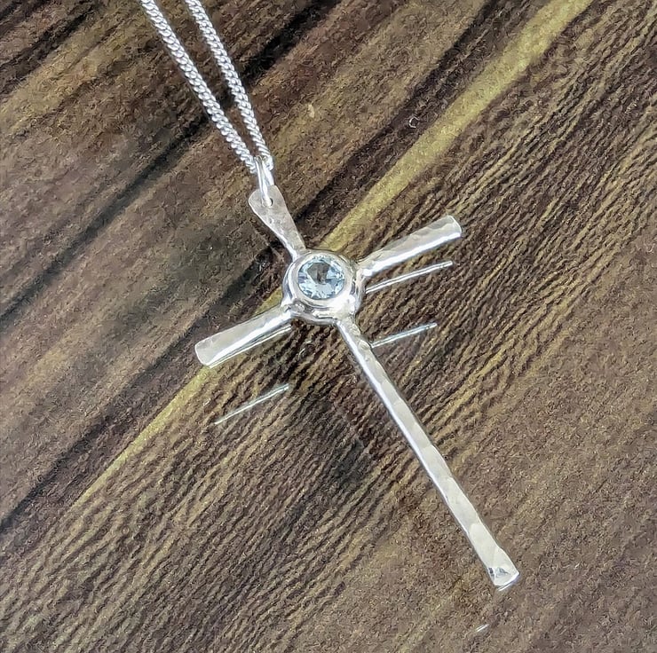 Handmade hammered dimple textured cross embellished with a 4 mm sky blue round faceted gemstone.