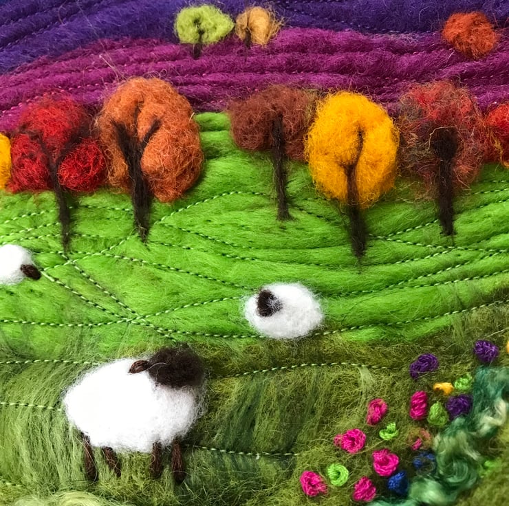 Countryside landscape felted in bright colours. Sheep in the foreground, and autumn coloured trees in the mid distance. Cerise pink and deep purple hills form the background.