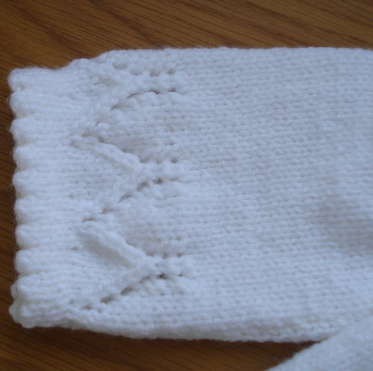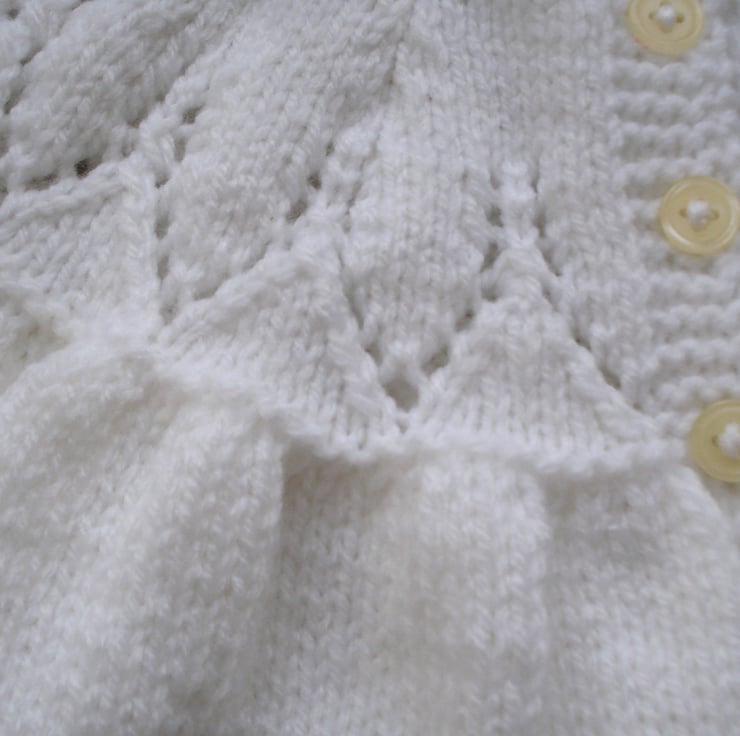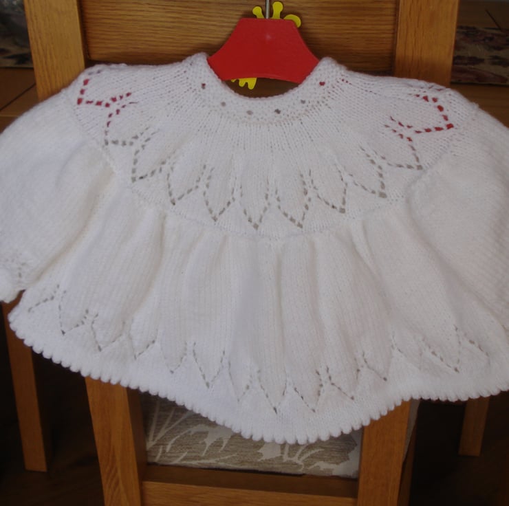 This is a hand knitted jacket, in pure white acrylic yarn, for a child six months plus. It has three buttons on the front and the whole item is gathered around a yoke giving it the flexibility to fit a child for longer. There is a pattern around the top and the bottom of the body and sleeves.