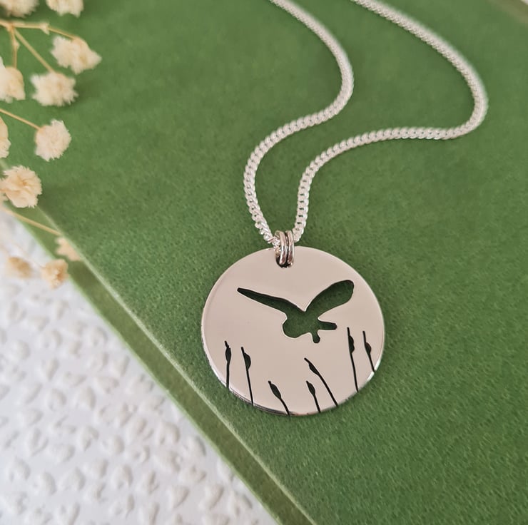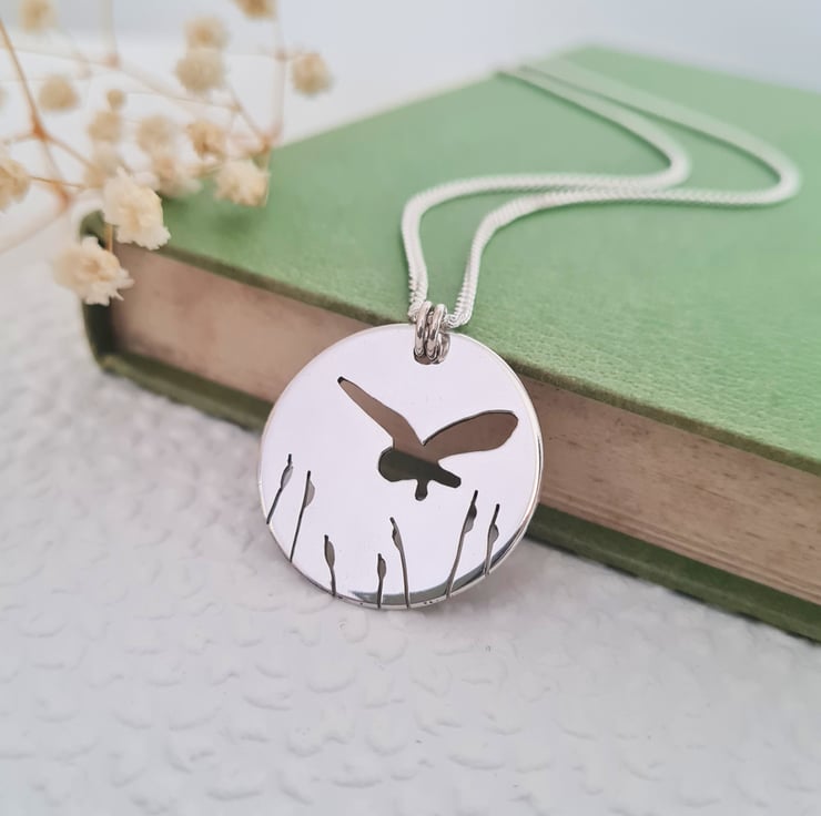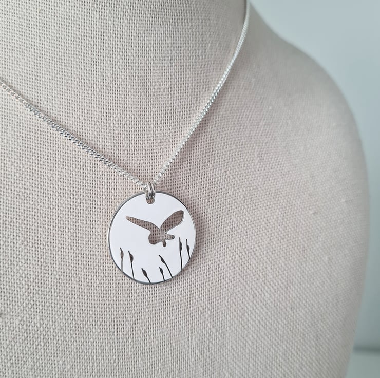 Using traditional silversmithing techniques of hand piercing this stunning pendant if made from solid sterling silver, featuring a Barn Owl in flight silently hunting along the edge of the Fens.