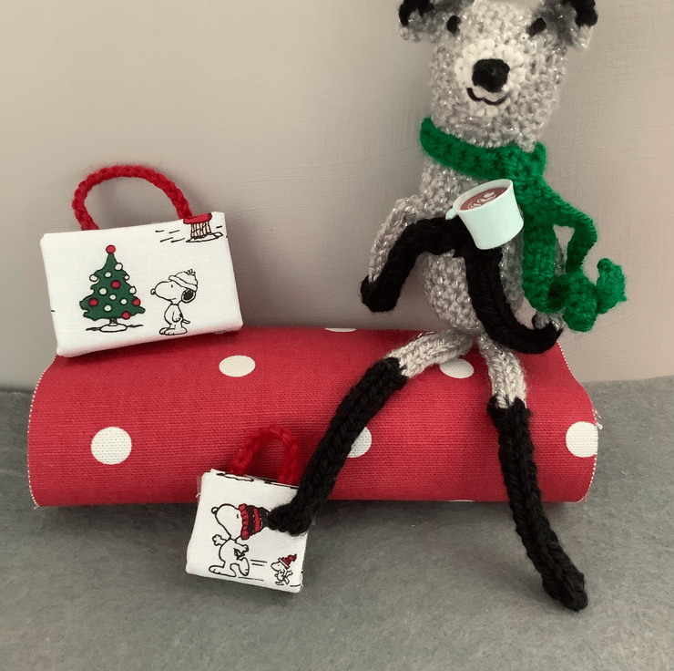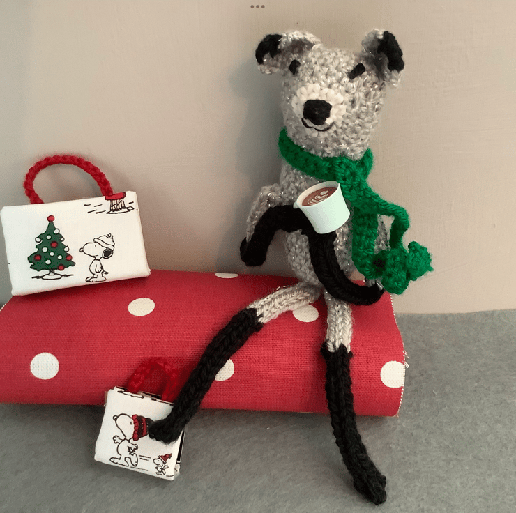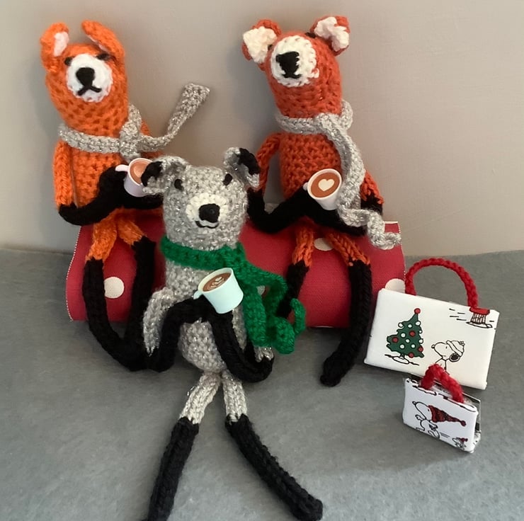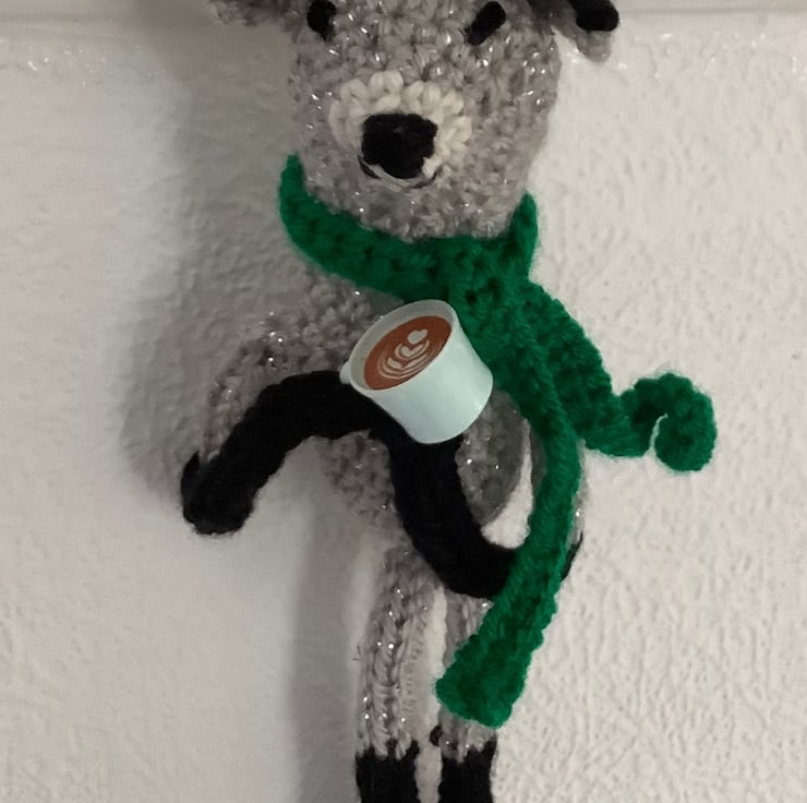 Crocheted Sparkly Silver Fox snuggly in his green scarf and holding his warm Festive Drink. Wearing Black socks. Hang him up or Let him take pride of place sat down. He measures 20cm long. This item is not a toy.