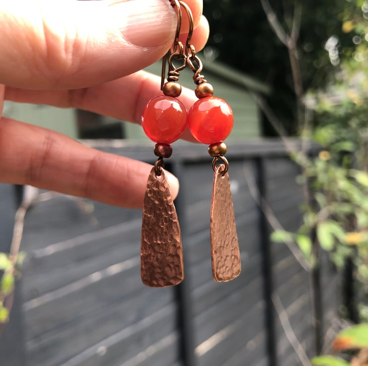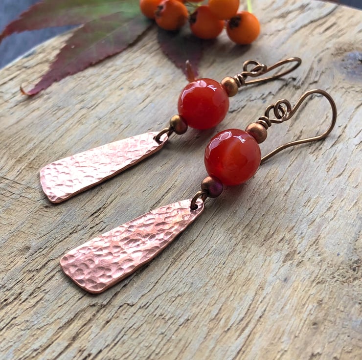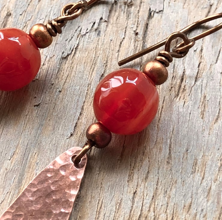 Lovey dangly Boho earrings with 10mm carnelian gemstone beads and handmade hammered copper dangles that have a rustic finish. The earrings are finished with handmade tarnish resistant coated copper hooks.
