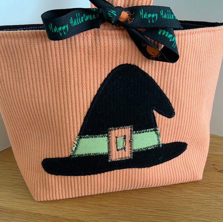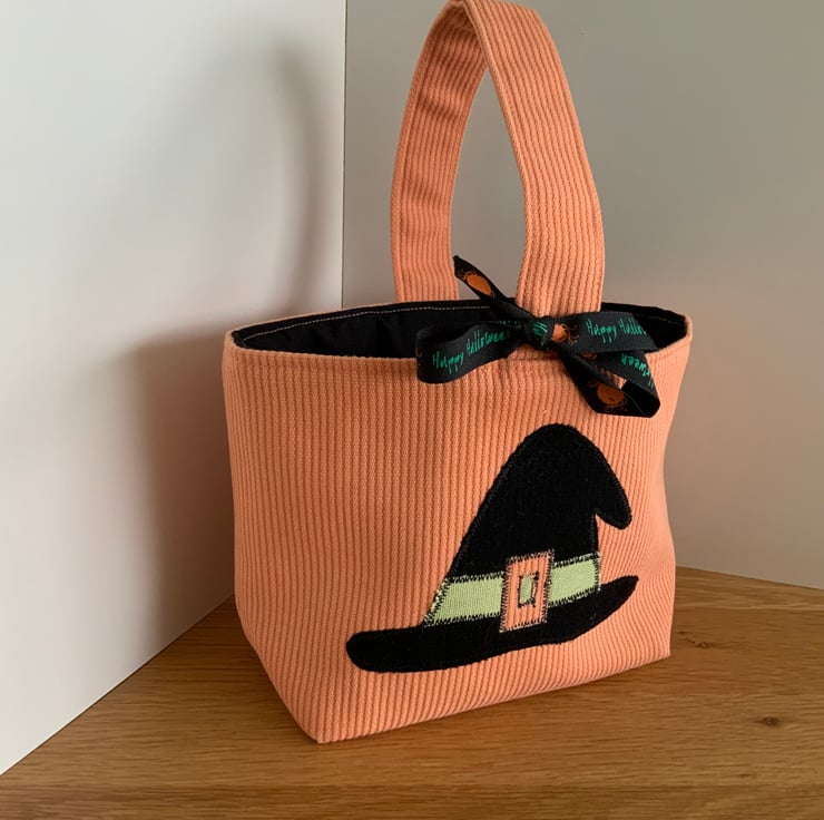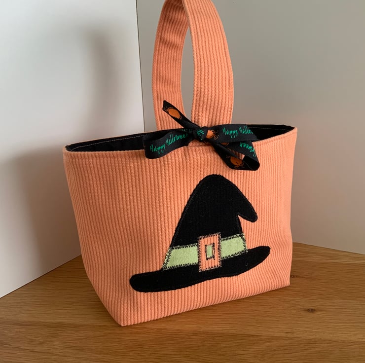 Made from orange ribbed cotton, lined in black cotton with a layer of interlining to give a little structure. Each bag has my own hand cut and sewn Halloween applique design. The basket is finished with a little hallow ribbon. The ribbon is hand tied and is removable.