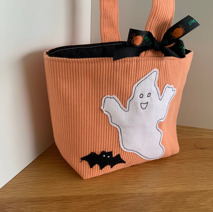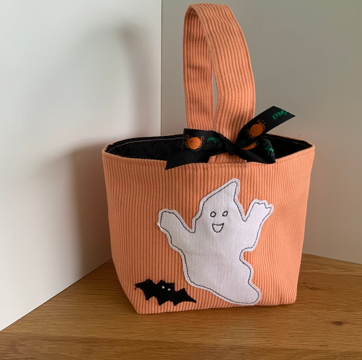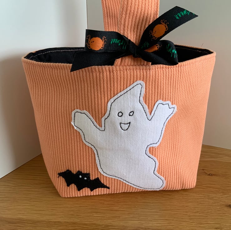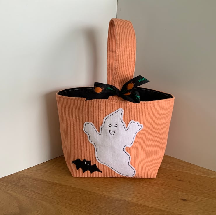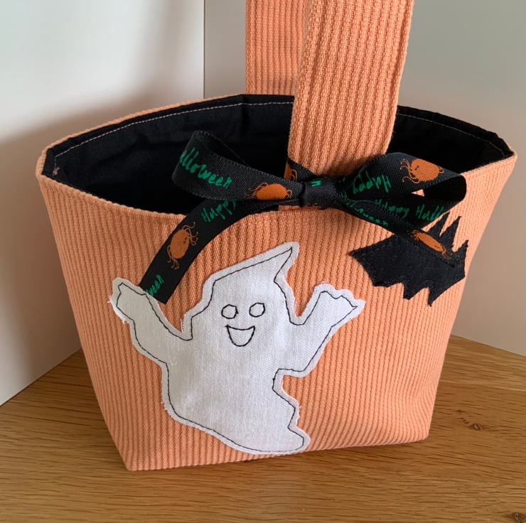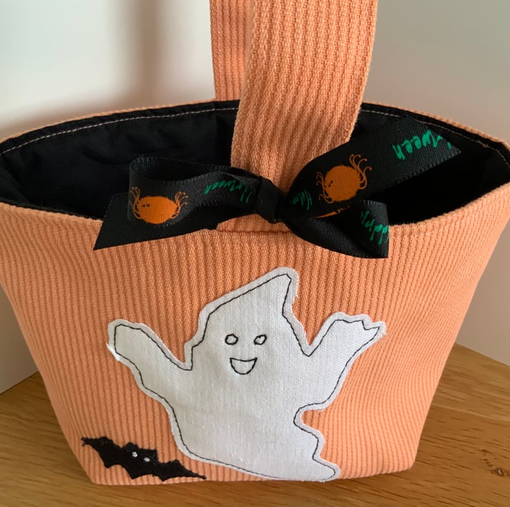 Made from orange ribbed cotton, lined in black cotton with a layer of interlining to give a little structure. Each bag has my own hand cut and sewn Halloween applique design. The basket is finished with a little hallow ribbon. The ribbon is hand tied and is removable.