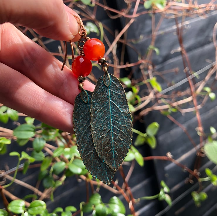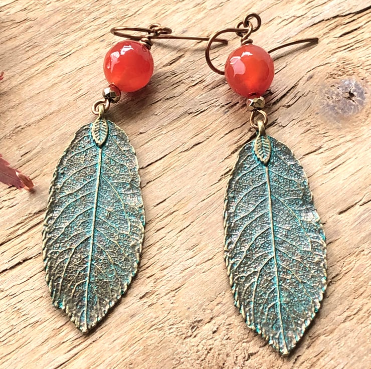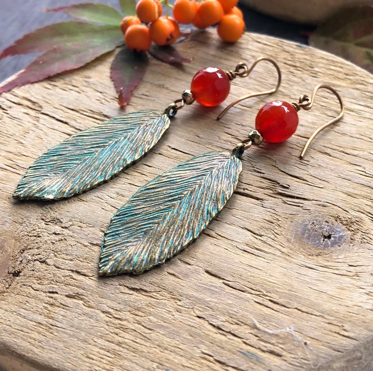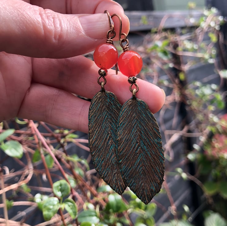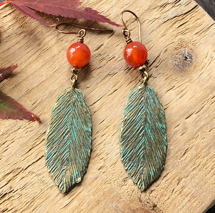 The earrings have 10mm lightly faceted Carnelian gemstone beads and big bronze tone dangles with a verdigris patina. They have a feather pattern on one side and a leaf on the other. I have added some small faceted Gold Pyrite beads for a little touch of sparkle.