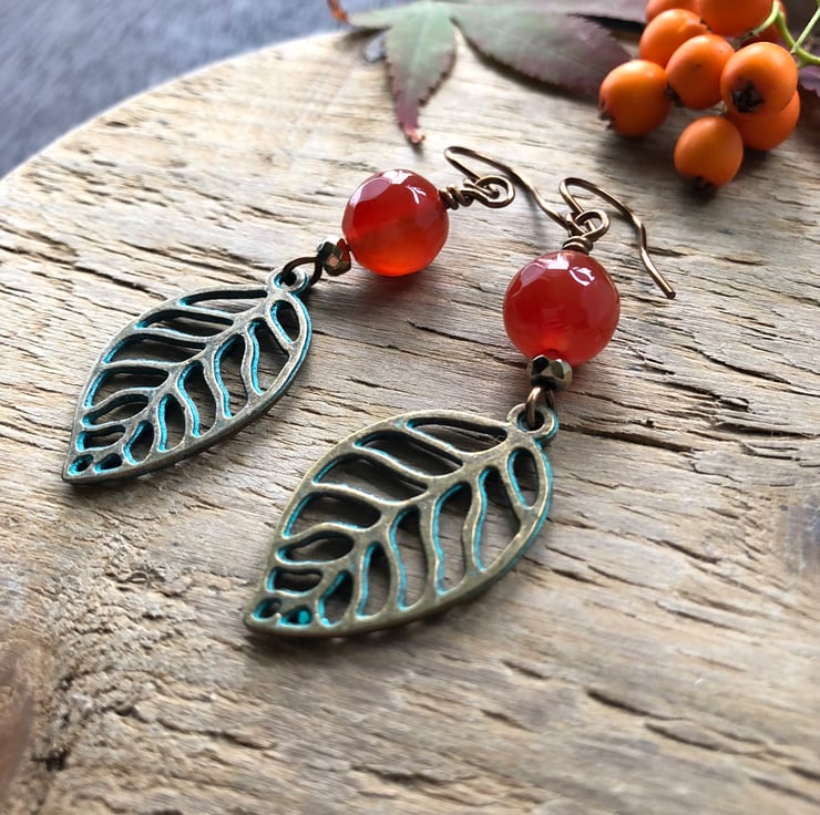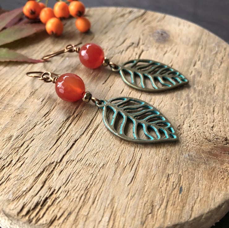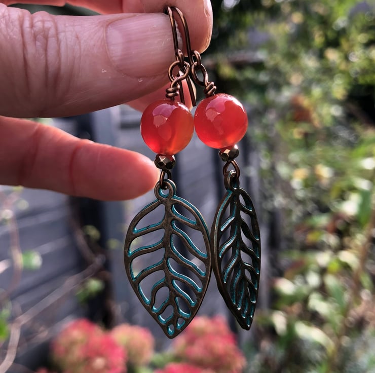 The earrings feature 10mm Carnelian Gemstone beads and bronze tone leaf charms that have a subtle verdigris patina. I have added small faceted Gold Pyrite beads for a touch of sparkle. The earrings are finished with handmade tarnish resistant coated copper hooks.