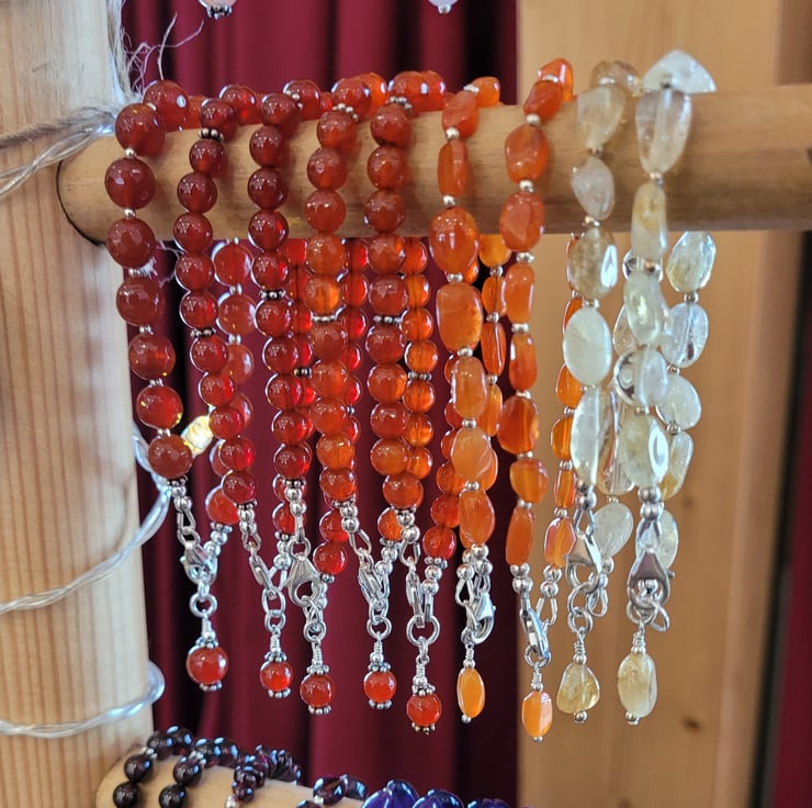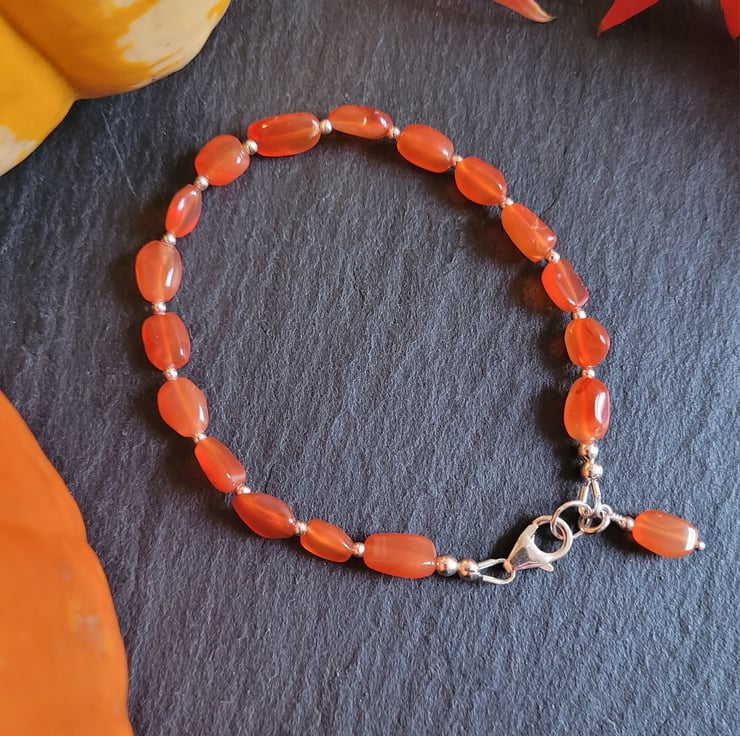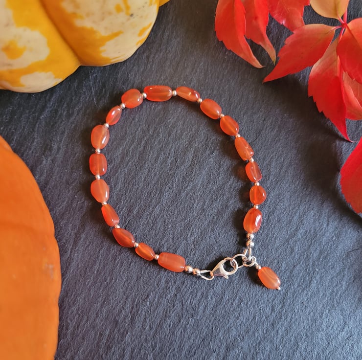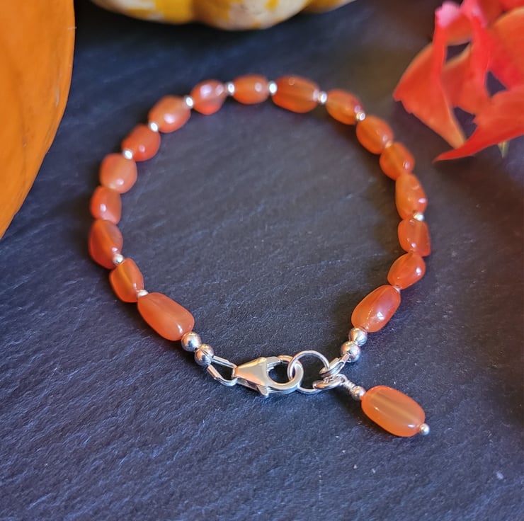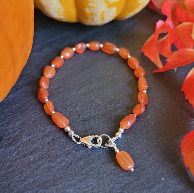 Inspired by the warming colours of Autumn, this pretty bracelet is made with oval orange carnelian gemstones interspaced with sterling silver beads. It is embellished with a matching carnelian charm stone. The bracelet fastens with a sterling silver carabiner clasp and is threaded on strong and flexible 49-strand jewellery wire. All the metal components of the bracelet are sterling silver.