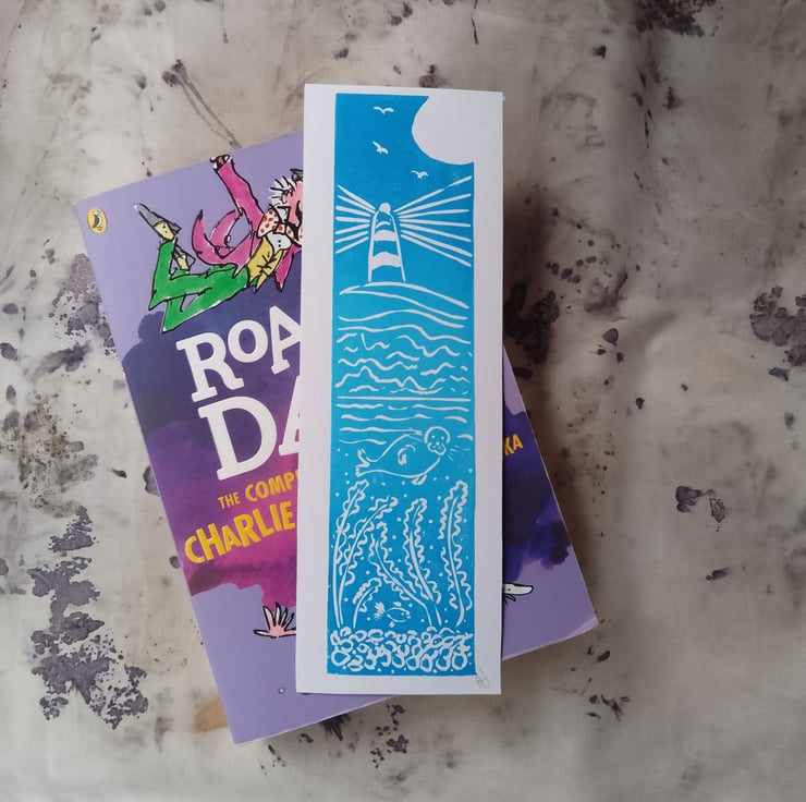Bookmarks, hand linoprinted in blue inks on white card. It shows a vertical slice of an imaginary coastal scene, with a seal playing in the seagrass at the base of the cliff rising to a lighthouse at the top. It is printed in a graduated dark to light to dark blue.