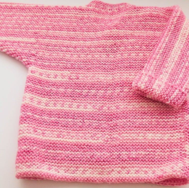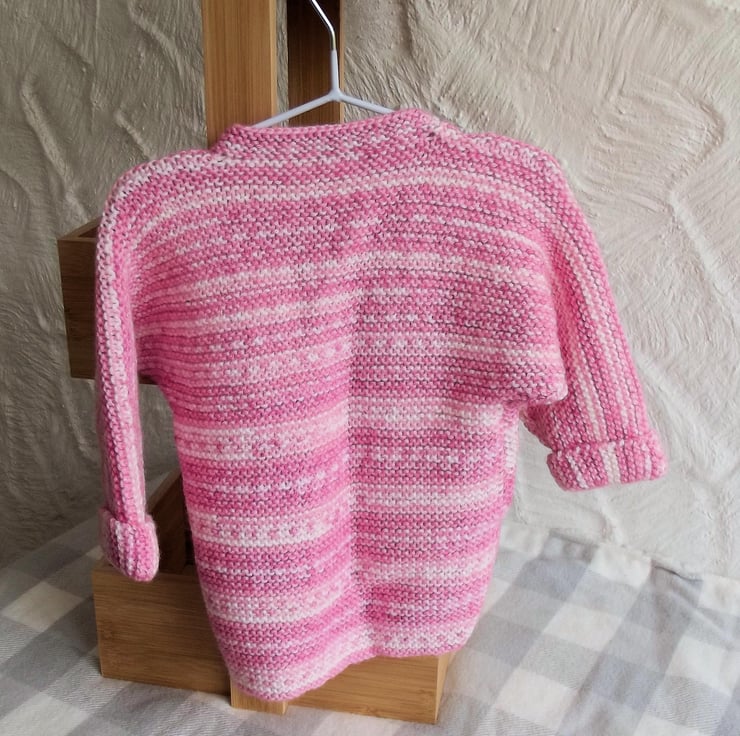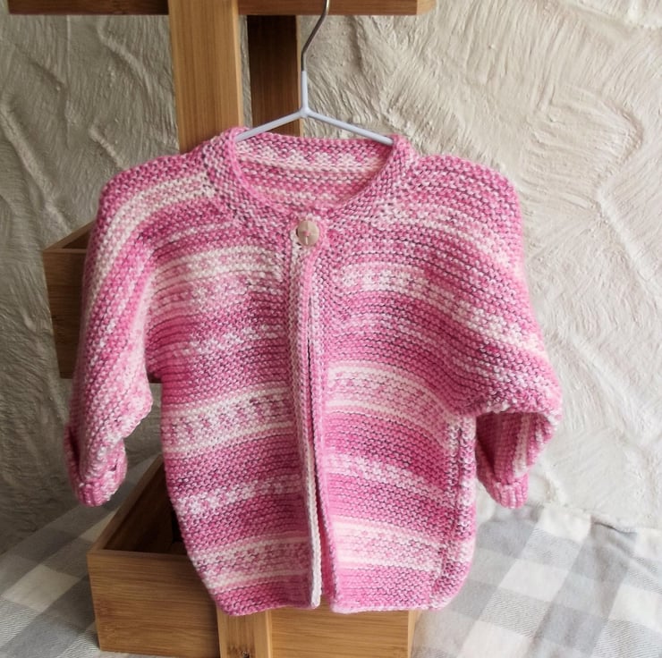 Hand knitted by me. Pink and White Babies Cardigan Jacket. Round neck with 1 button closure. Knitted in medium weight acrylic blend yarn. hm43