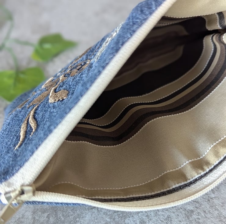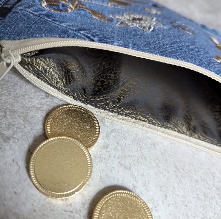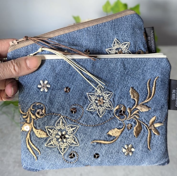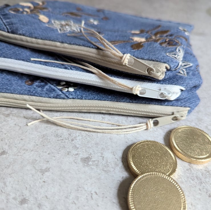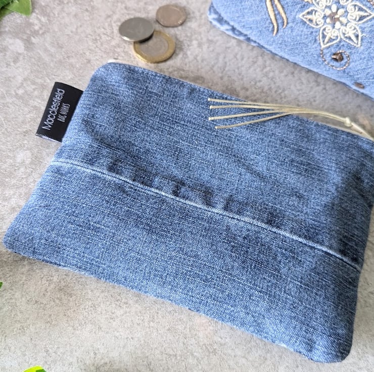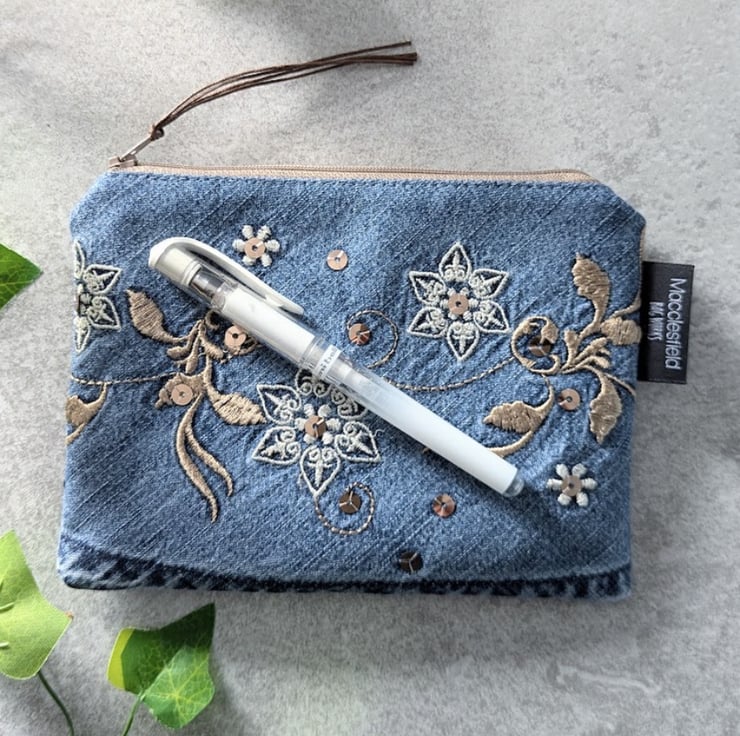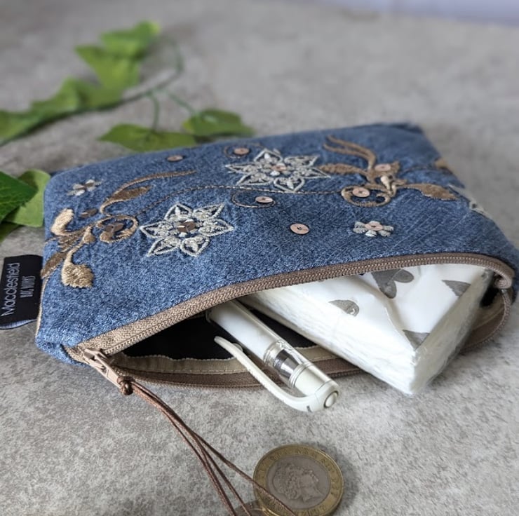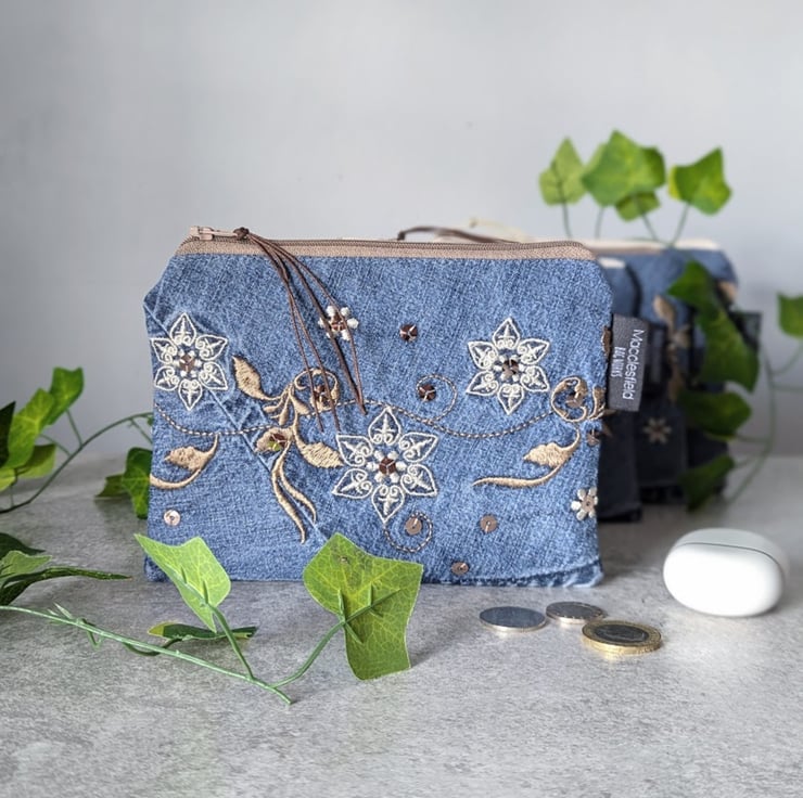 Recycled chambray denim pouch purse handmade from a pre-loved skirt. Making the most of an embellished and embroidered hemline, these handy pouches have loads of glam and are available in three options