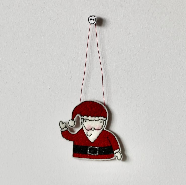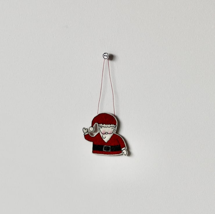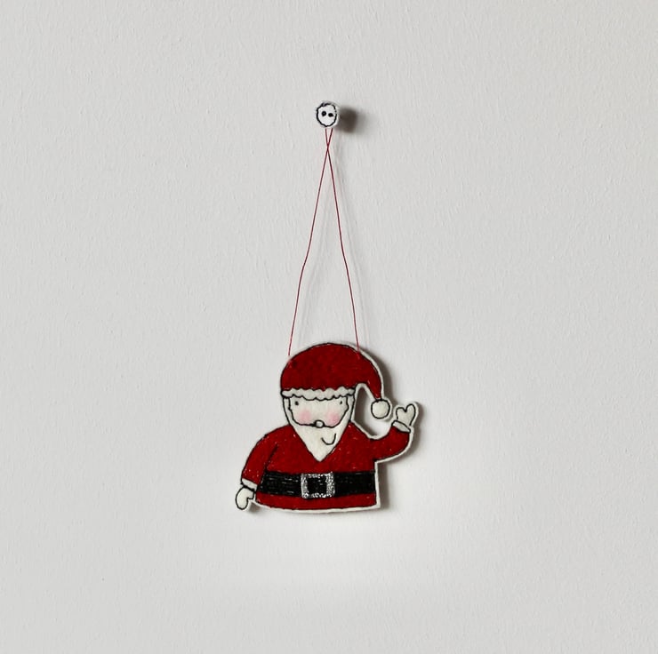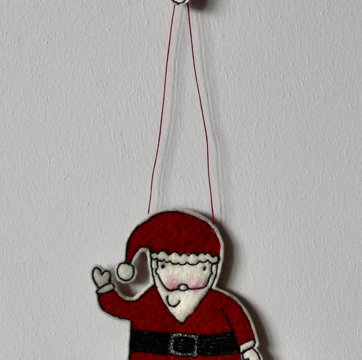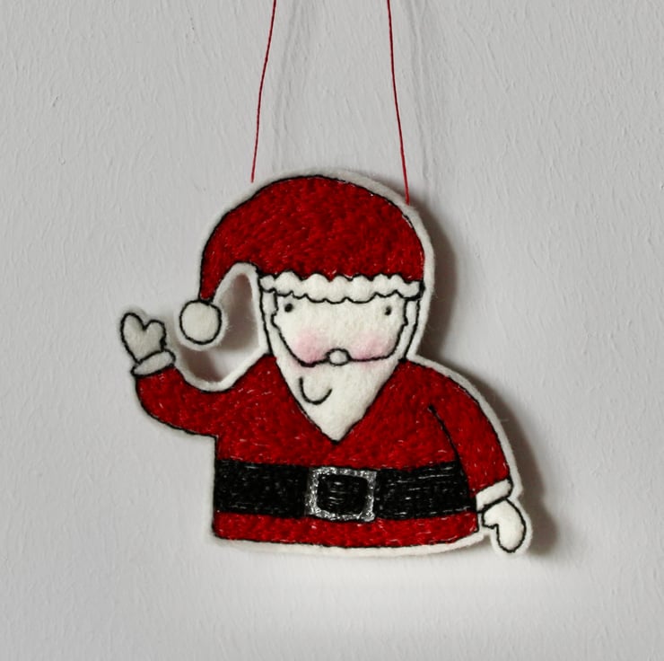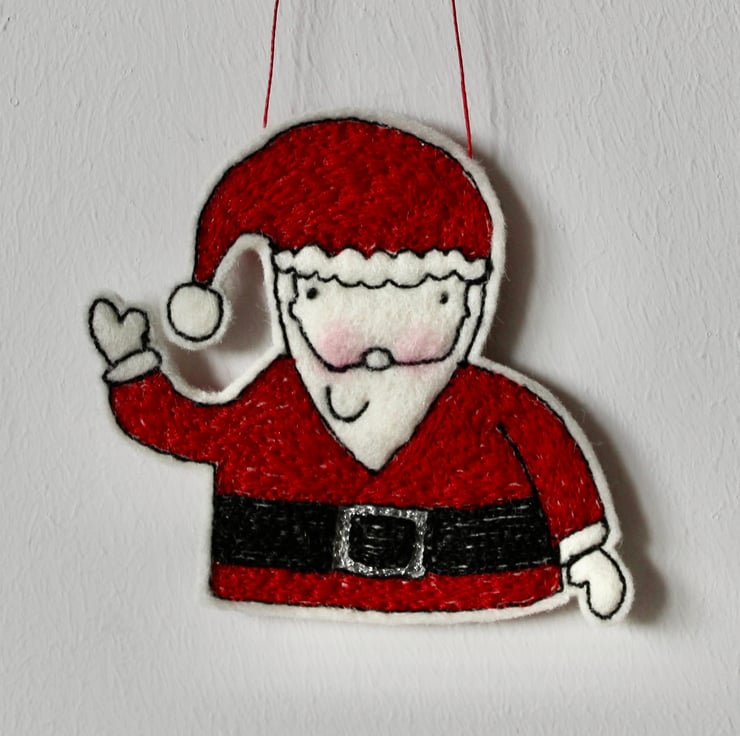 Father Christmas is created using 100% wool felt, free hand machine embroidery and is cut out by hand using sharp scissors. His is red jacket and hat are created using stitching.