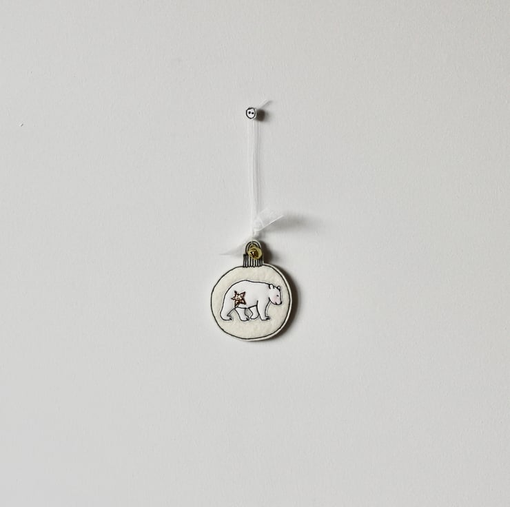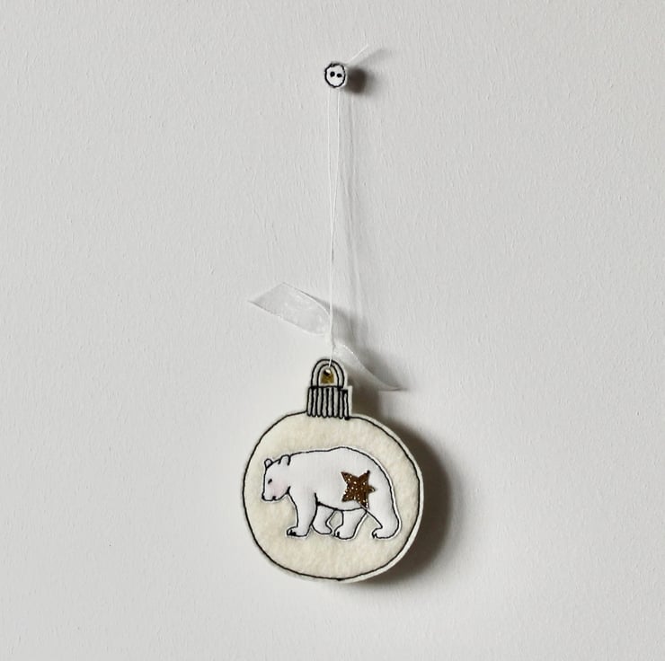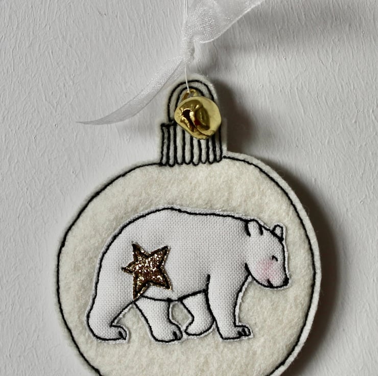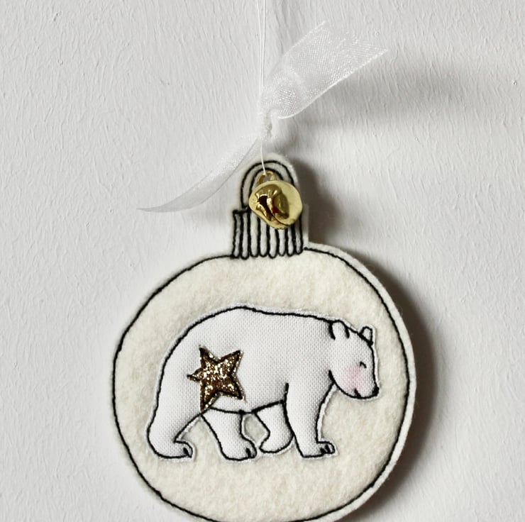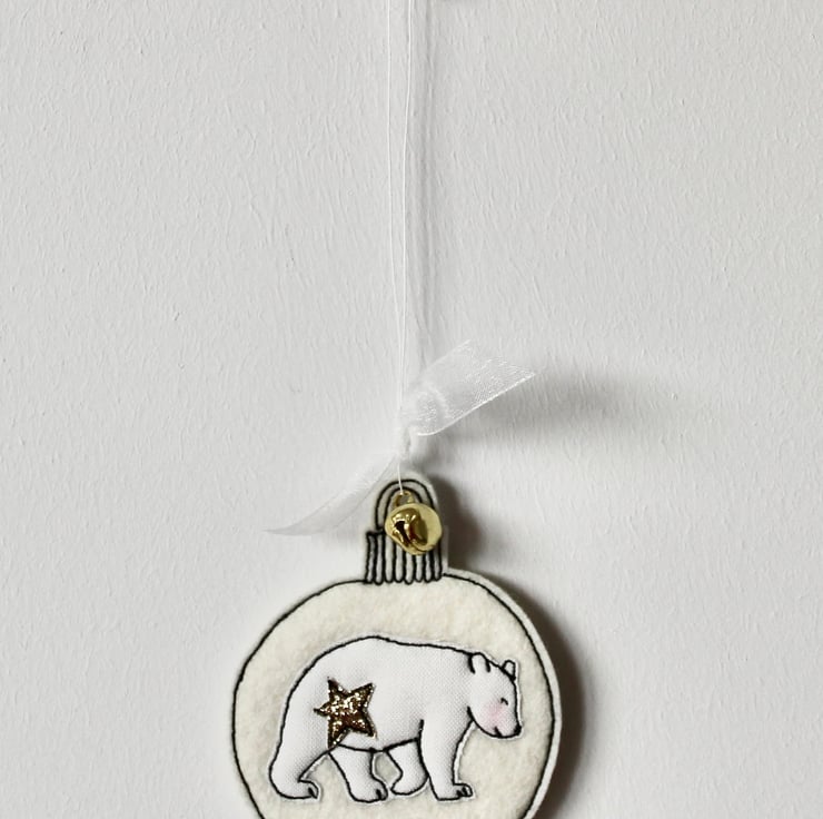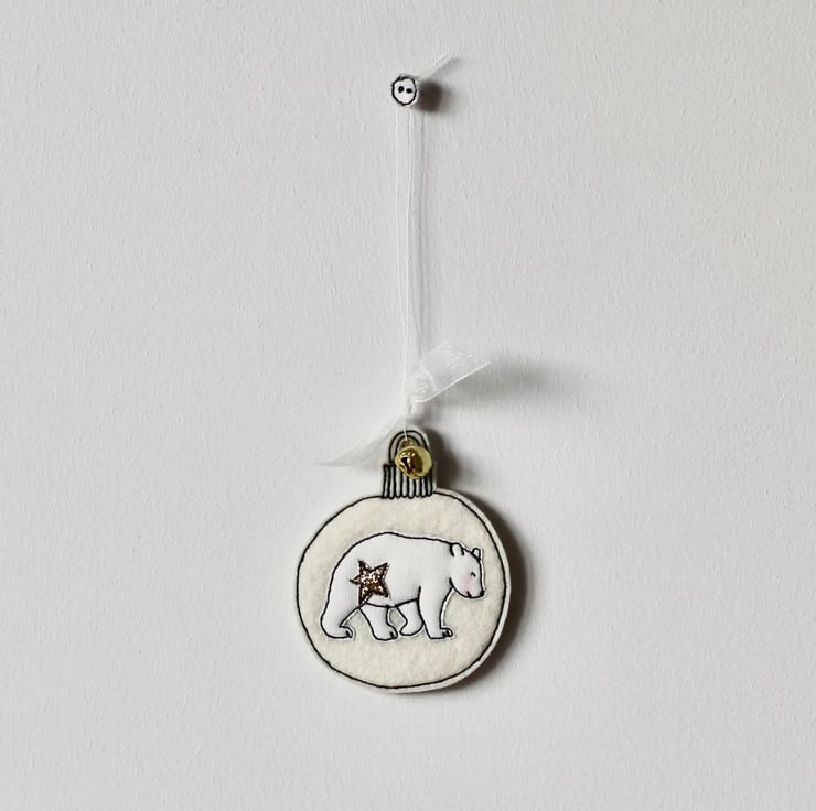 Delightful hanging decorations which are created using 100% wool felt, cotton cloth, glitter cloth, metal bells, organza ribbon, free hand machine embroidery and cut out by hand, using a very sharp pair of scissors.