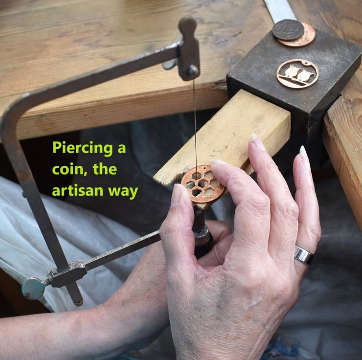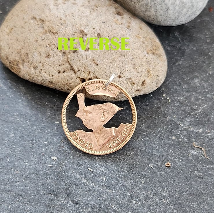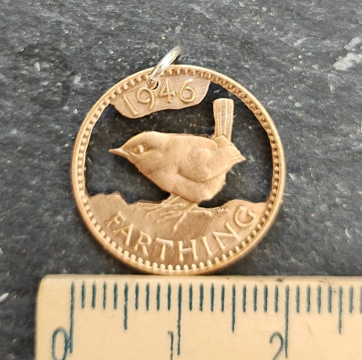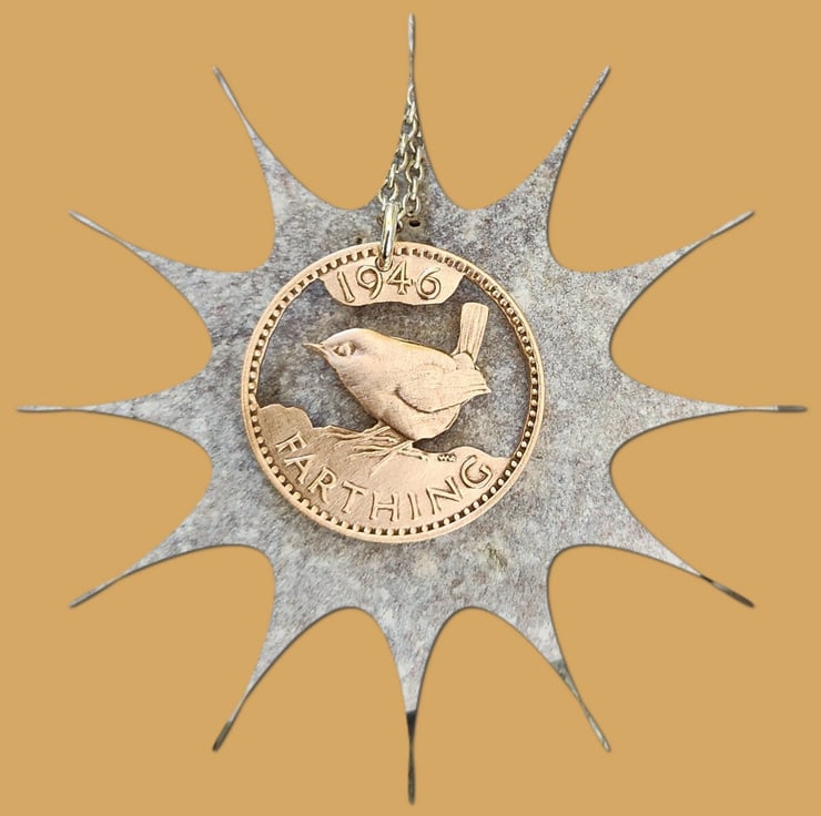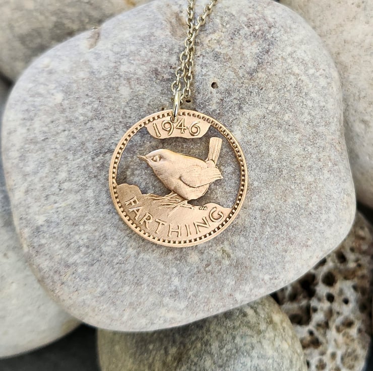 A 1946 bronze farthing with the hand-pierced outline of the wren on the reverse side. The piercing is done with a fine-bladed jewellers saw, it is NOT laser cut. 2cms across. Finished with a sterling silver chain, 16 or 18inch, you choose.