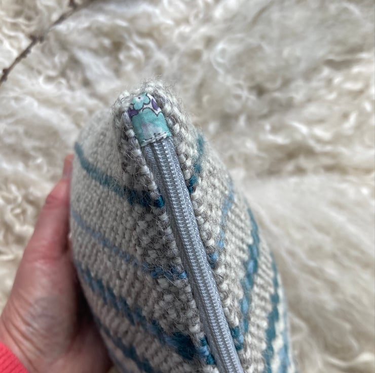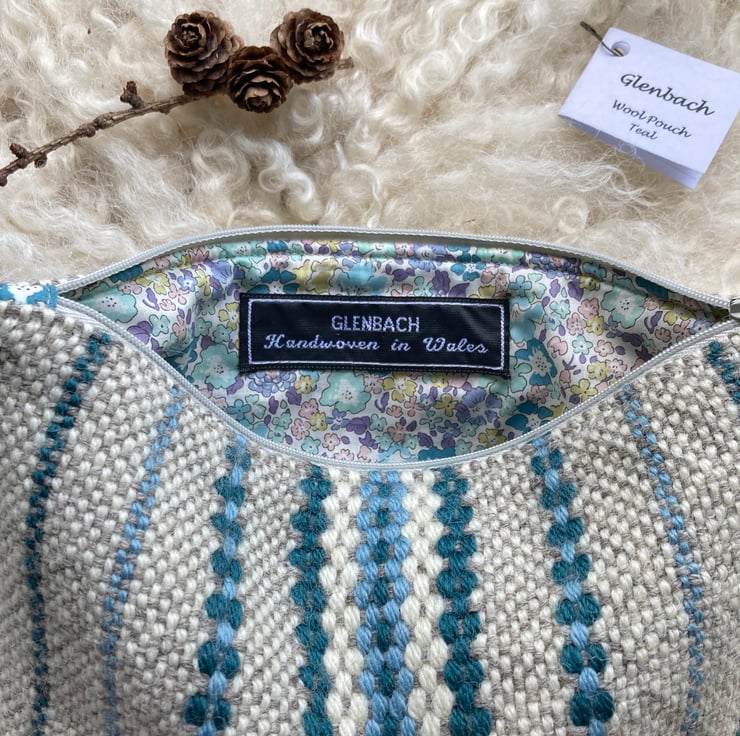 Our Wool pouch is handwoven using natural grey and ecru wool with a contrast of teal and pale blue - all British wool.