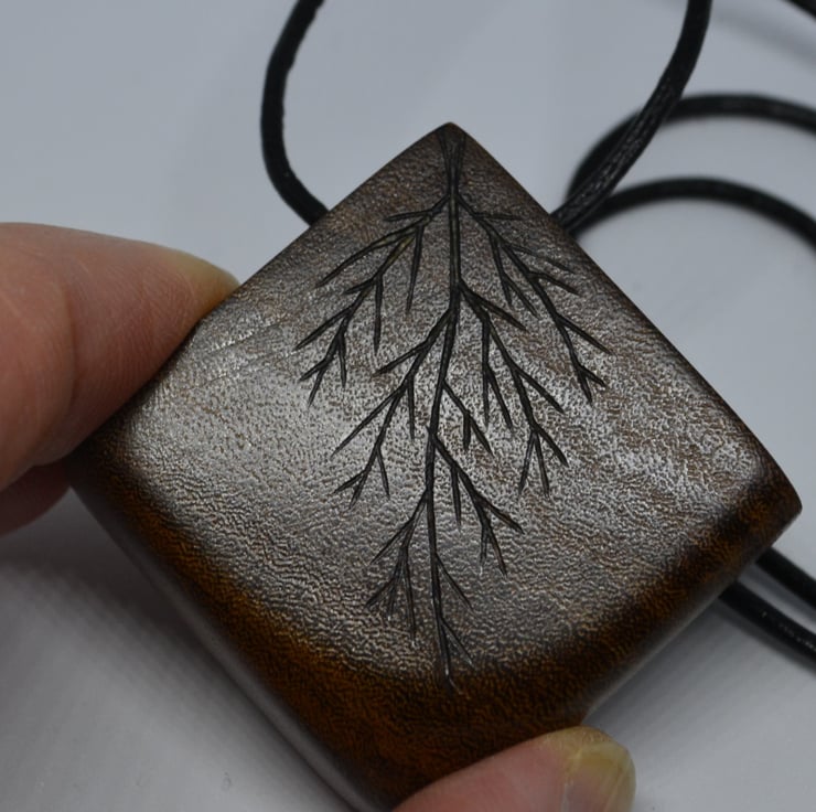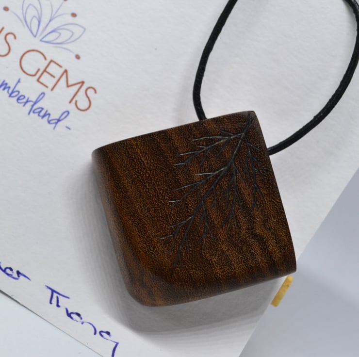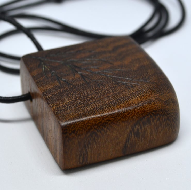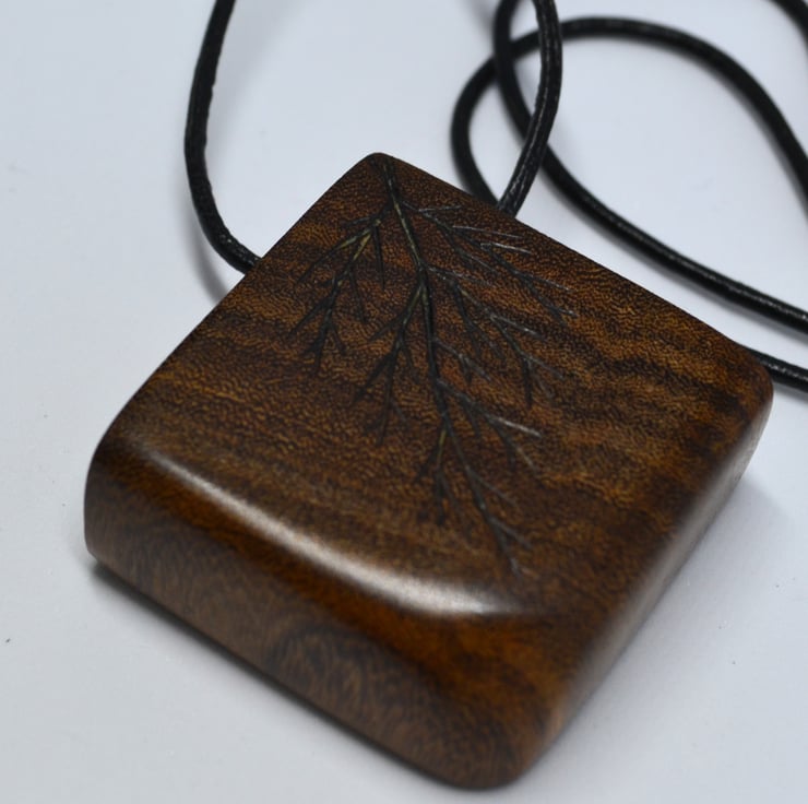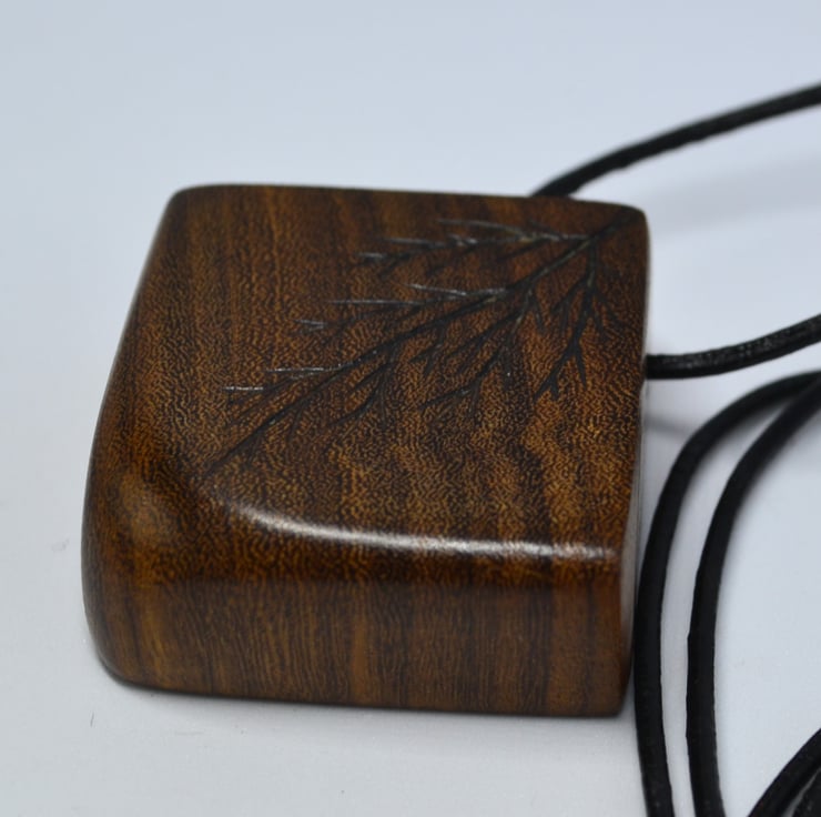 This chunky teak pendant is a rich dark brown colour. Graham has used a pyrography pen to add the tree design. Each tree is done by freehand so each tree is unique. The pendant is approx. 4.8cm x 4.8cm and is roughly 1.2cm thick. There is a length of black leather cord with sliding knots so you can alter the length of the pendant.