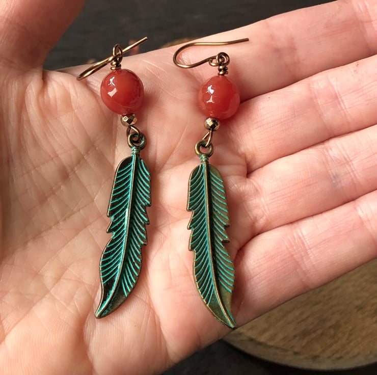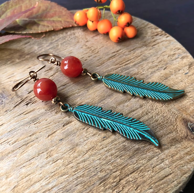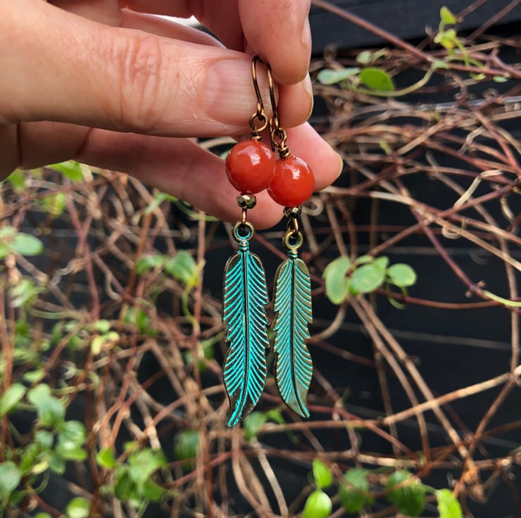 The earrings feature 10mm deep orange Carnelian gemstone beads and long antique bronze tone feathers with a verdigris patina. I have added small faceted Gold Pyrite beads for a touch of sparkle.