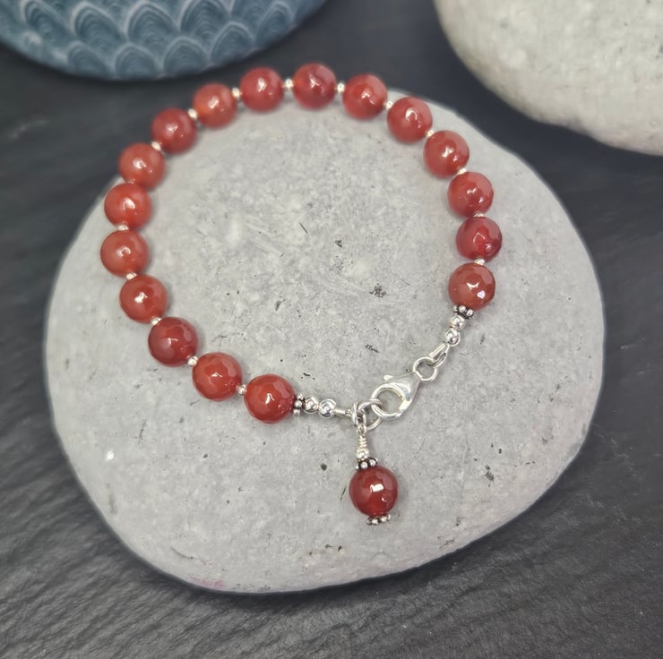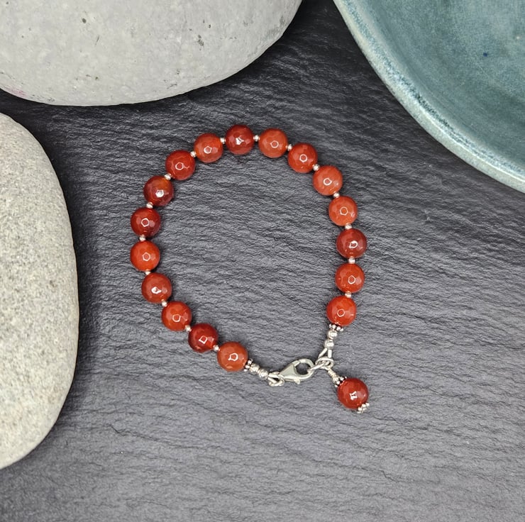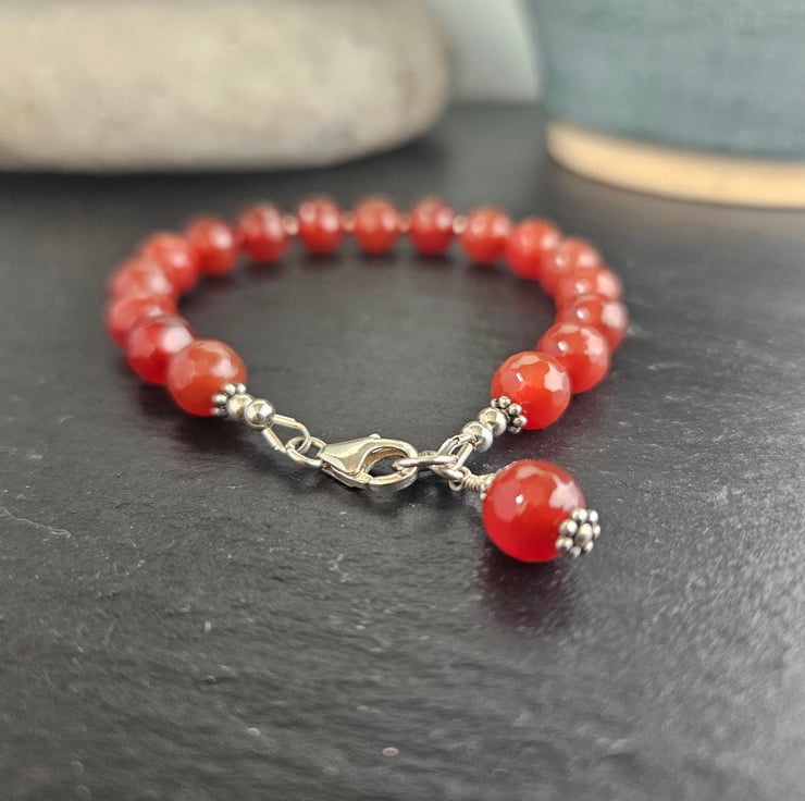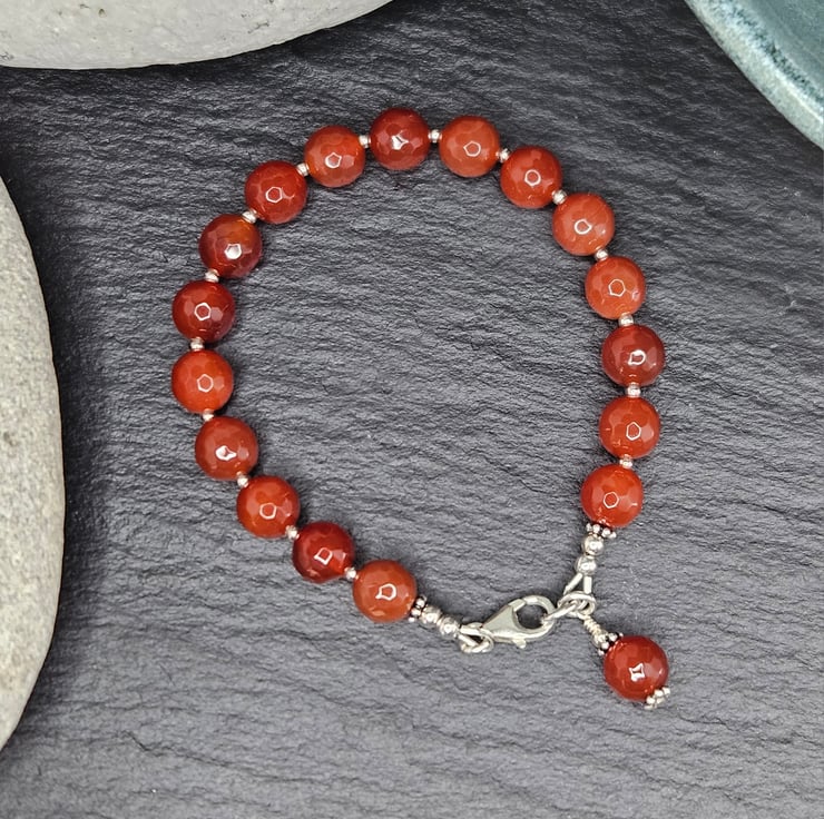 Inspired by the warming colours of Autumn, this pretty bracelet is made with 8mm faceted orange-red carnelian gemstones interspaced with sterling silver beads and Bali flower-shaped spacers. The bracelet fastens with a sterling silver carabiner clasp and is threaded on strong and flexible 49-strand jewellery wire. All the metal components of the bracelet are sterling silver.