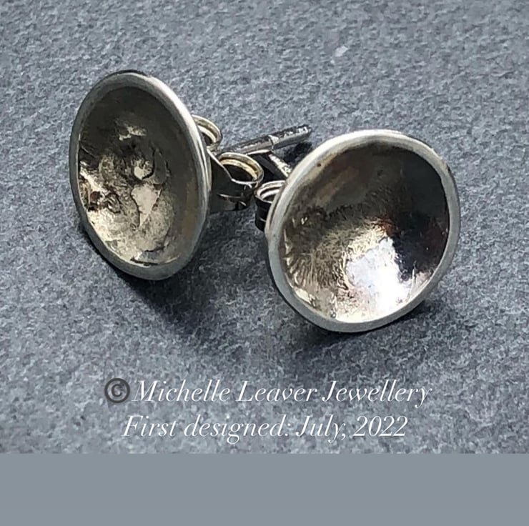These Silver round studs are made from Sterling Silver and melted 9ct yellow gold. They measure approximately: 9mm in diameter and are concave. The circumference on each stud is flat, smooth and shiny silver. The back of the studs are smooth silver and the posts and push on backs are also Sterling Silver. If you would like the studs a slightly different size please leave a message at Checkout.