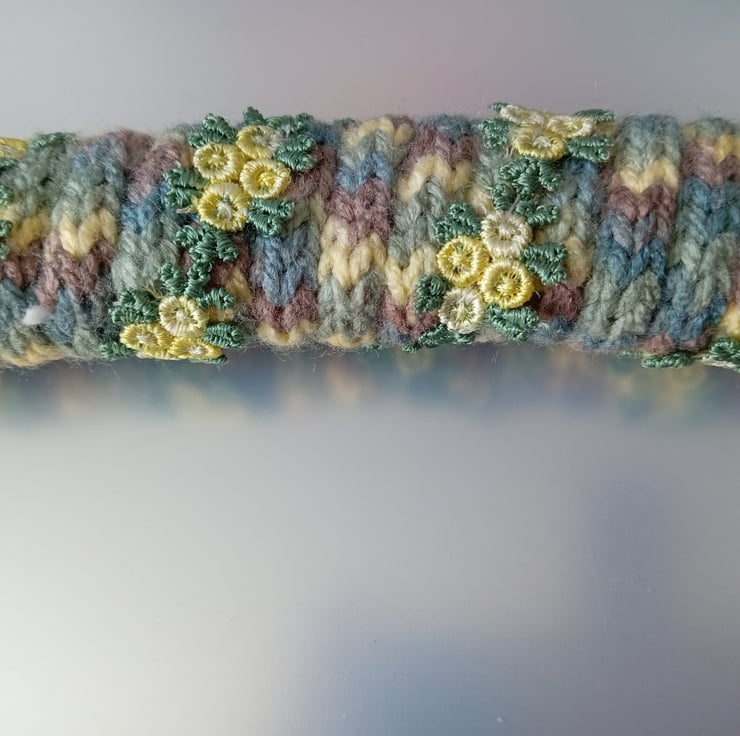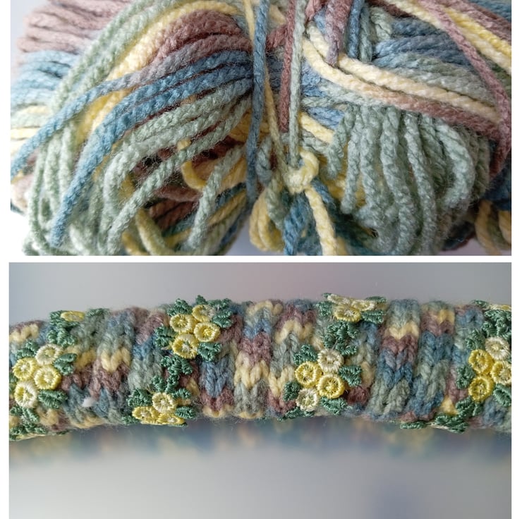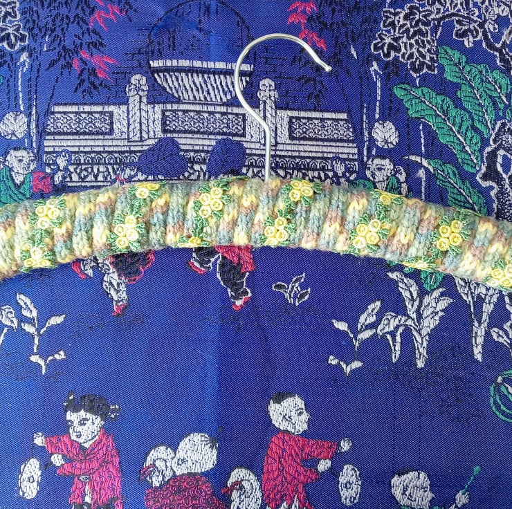 I've taken a wooden crescent clothes hanger and wrapped it in i-cord (french knitted cord) made with a multicoloured acrylic yarn. I hand stitched the yellow/green floral lace over the base. The colours of the yarn and lace really compliment each other.