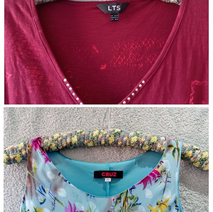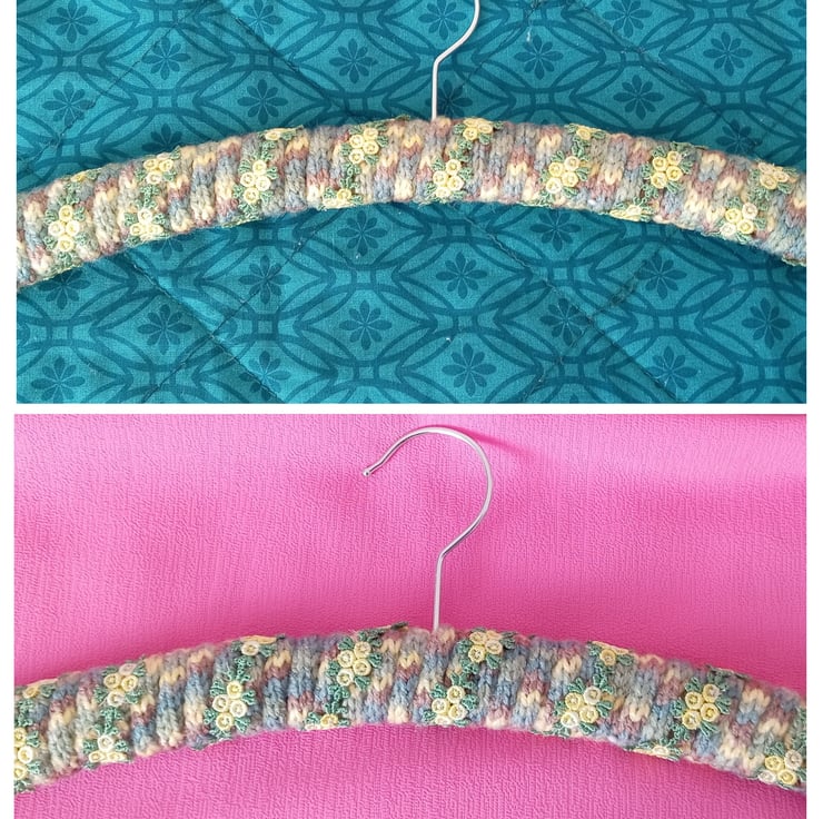 I got sick of things falling off hangers in my wardrobe I decided to rectify it. The inspiration was the beautiful fabric covered hangers that I’ve seen. These are slightly better at gripping the clothes, even satiny light fabrics stay in place on these.