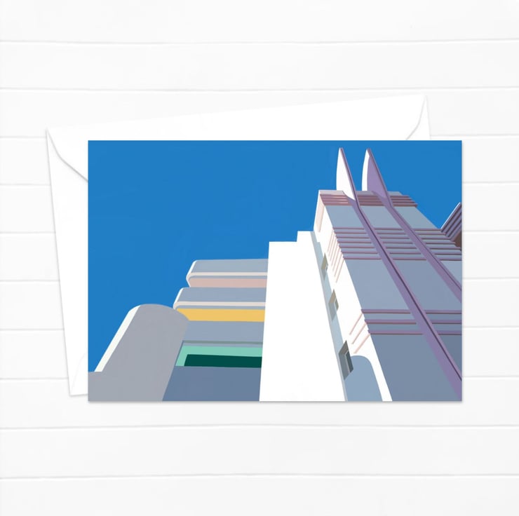 Classic American deco architecture greetings card. Inspired by our own love of art deco design and pastels. The perfect mix!