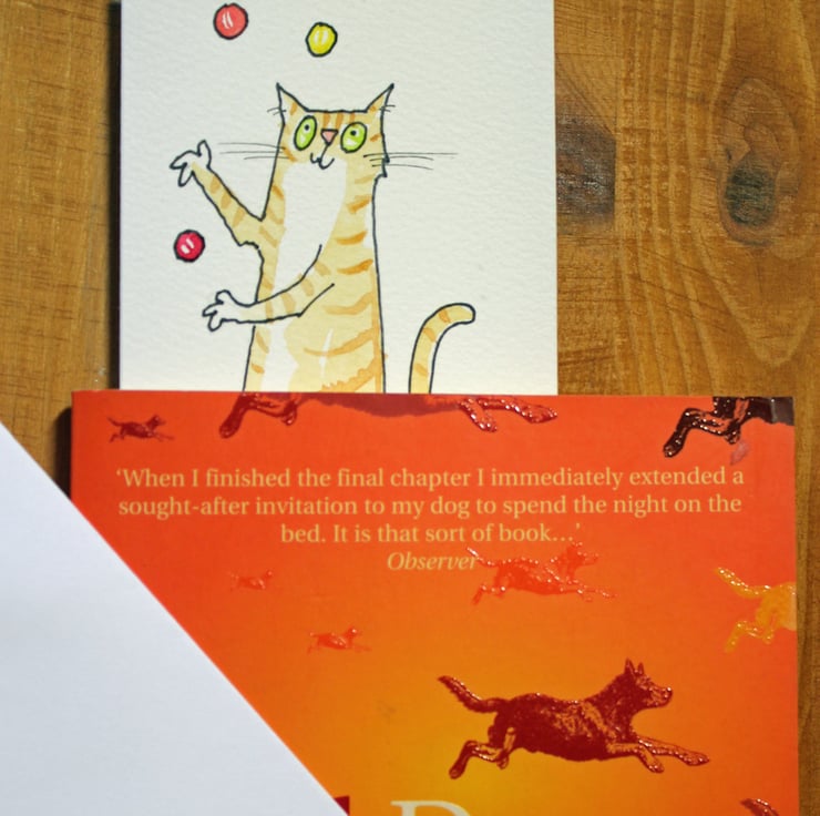This cat card is hand drawn and then outlined in pen and ink before being painted with watercolour on a pre-creased watercolour type paper card.