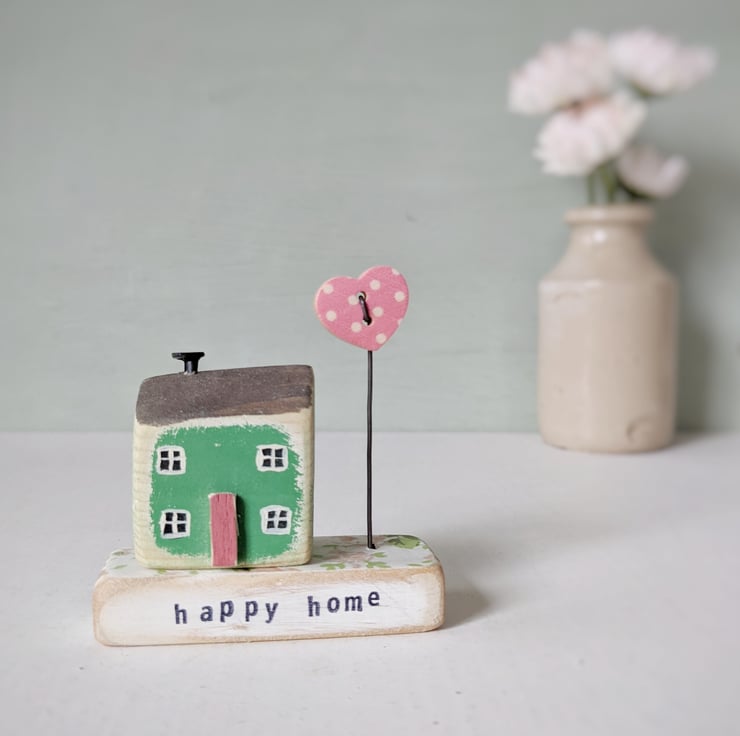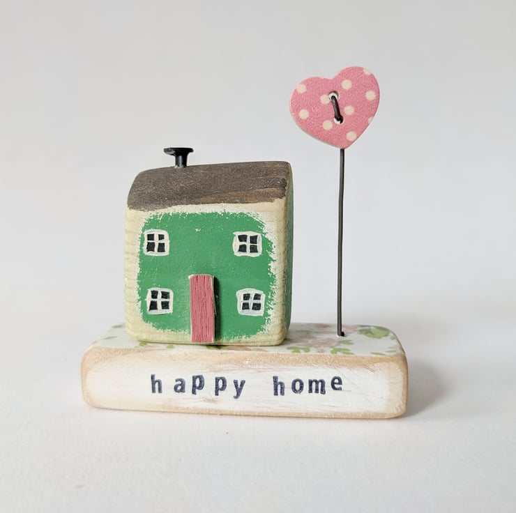 A hand stamped wooden base with a teeny painted house and a jolly heart on a wire to stand beside it.